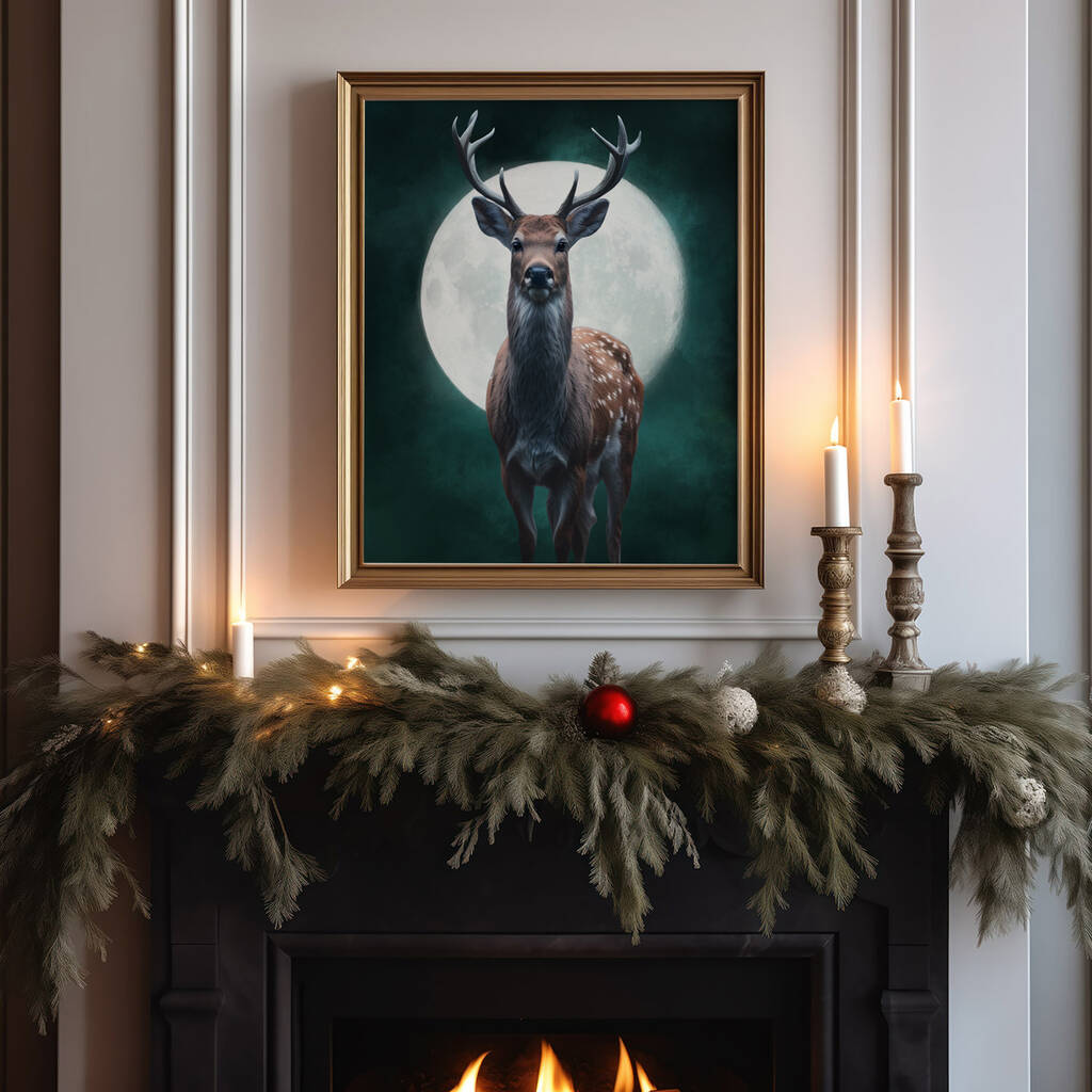 A striking moonlit stag artwork with an emerald background, perfect for adding seasonal warmth, nature-inspired elegance, and woodland charm to any home décor.