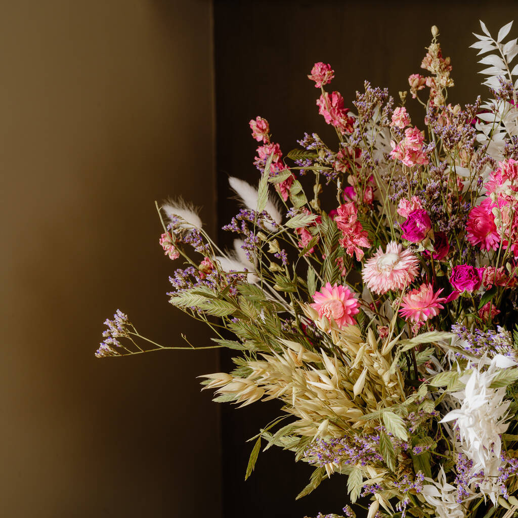Dried flowers are a natural, eco-friendly product, making them a beautiful and sustainable gift choice. Over time, they will naturally degrade, reflecting their organic origins and life cycle. Unlike fresh flowers, they require no water or chemicals to maintain, and their longevity reduces waste, offering a thoughtful, planet-friendly alternative to traditional gifts. How to Care for Dried Flowers Dried flowers are a beautiful, low-maintenance option for long-lasting decor. Follow these tips to keep them looking their best: Keep Them Dry: Avoid exposing dried flowers to water or high humidity, as moisture can cause them to wilt or grow mold. Avoid Direct Sunlight: Prolonged exposure to direct sunlight can cause the colors to fade. Place them in a shaded or softly lit area. Handle with Care: Dried flowers are delicate, so handle them gently to avoid breakage or shedding petals. Dust Lightly: Use a soft feather duster, a gentle blow of air, or compressed air on a low setting to remove dust. Avoid High-Traffic Areas: Keep your arrangement away from strong drafts, busy areas, or frequent touching to prevent damage. With proper care, dried flowers can maintain their beauty for months or even years