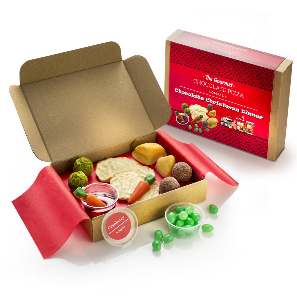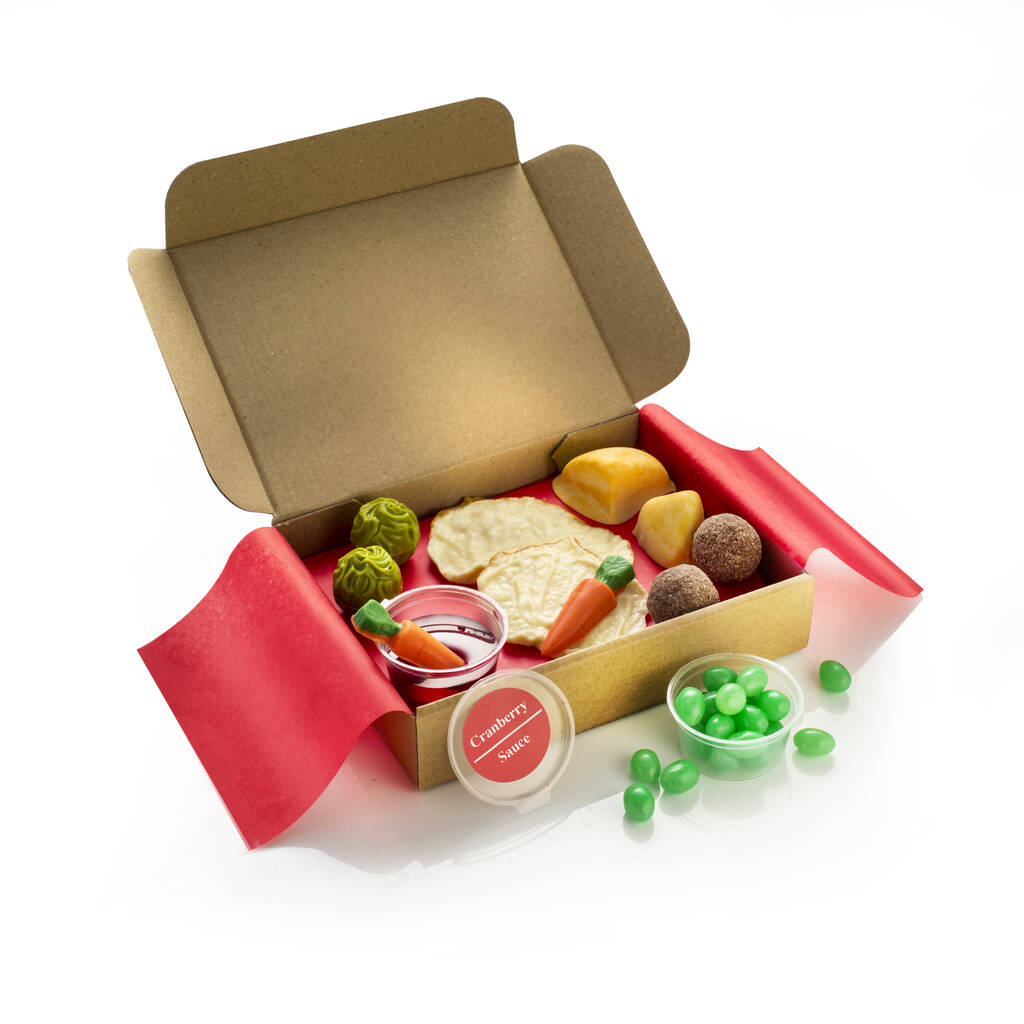 A roast Christmas dinner... all made from premium Belgian chocolate and other delicious 'trimmings!'Each box contains all the best elements of a traditional festive dinner, including turkey, roast potatoes, brussel sprouts and carrots, all made from deliciously creamy Belgian white chocolate - and of course, a raspberry dipping sauce to mimic the classic cranberry. We've even included jelly beans for peas, and caramel chocolate truffle 'stuffing balls' for the all-important finishing touches!