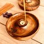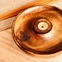 Hand carved into a sweet small bowl shape & lightly finished to bring out the natural colours of the beautiful wood grain.This incense holder bowl is detailed with small engraving of a Buddha in meditation along the bowl edge.