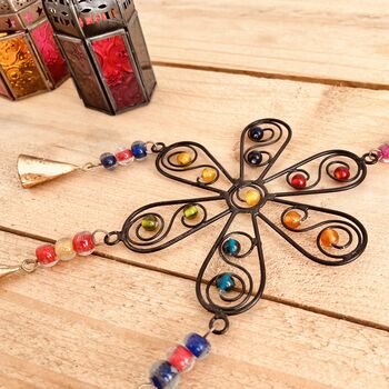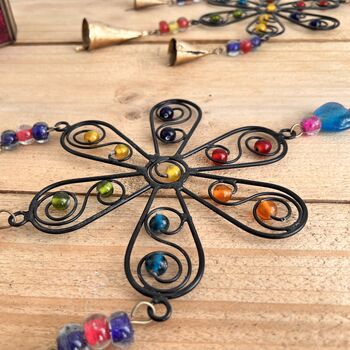 A beautifully handmade hanging flower design wind chime perfect for bringing the calming sound of bells to your home, living & relaxation spaces. This has a rustic cast iron finish in dark metal with mini cow bells hanging below embellished with vibrant glass beads.