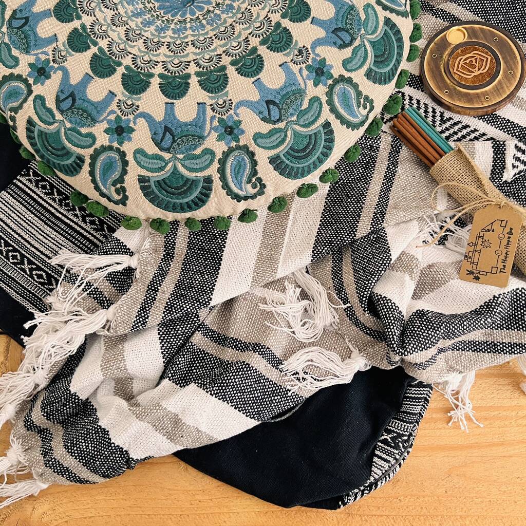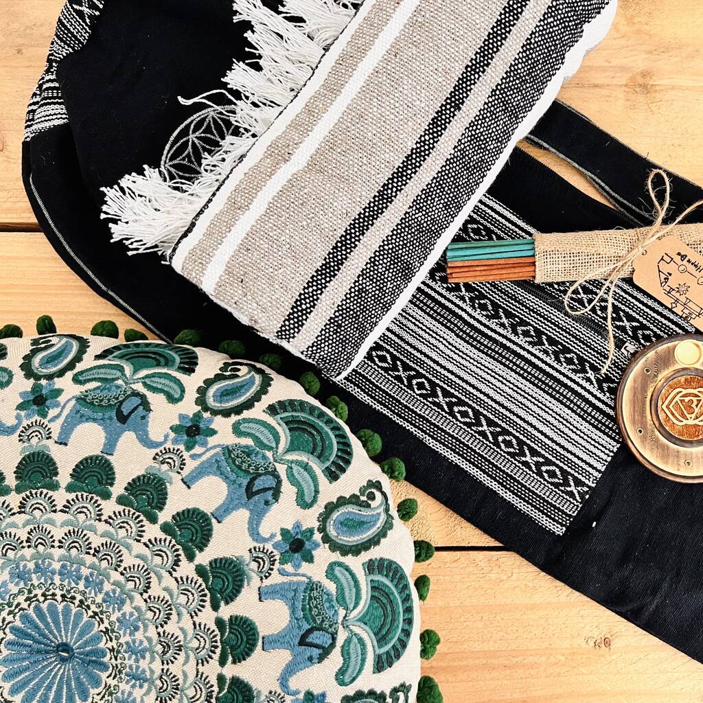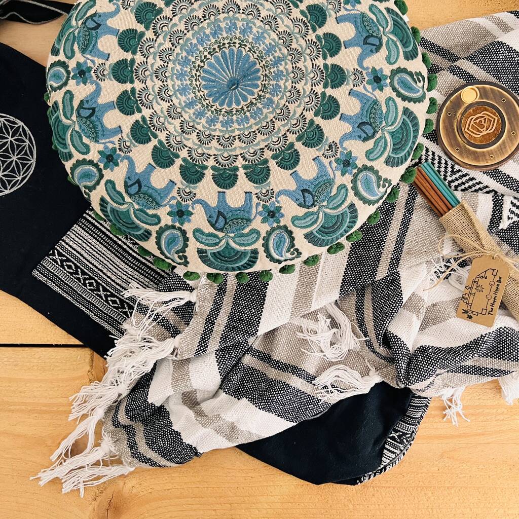 Create calm, balance, and focus with our handcrafted meditation set, designed to ground your space and soothe your spirit. Handcrafted meditation and yoga set in black and teal tones - includes cushion, throw, incense, and holder for calm, grounding, and mindful living.