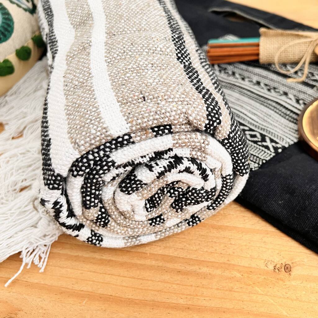 Handwoven Cotton Throw: Soft and sustainable, in natural black and cloud grey tones perfect for relaxating warmth, comfort, or as a grounding meditation shawl.