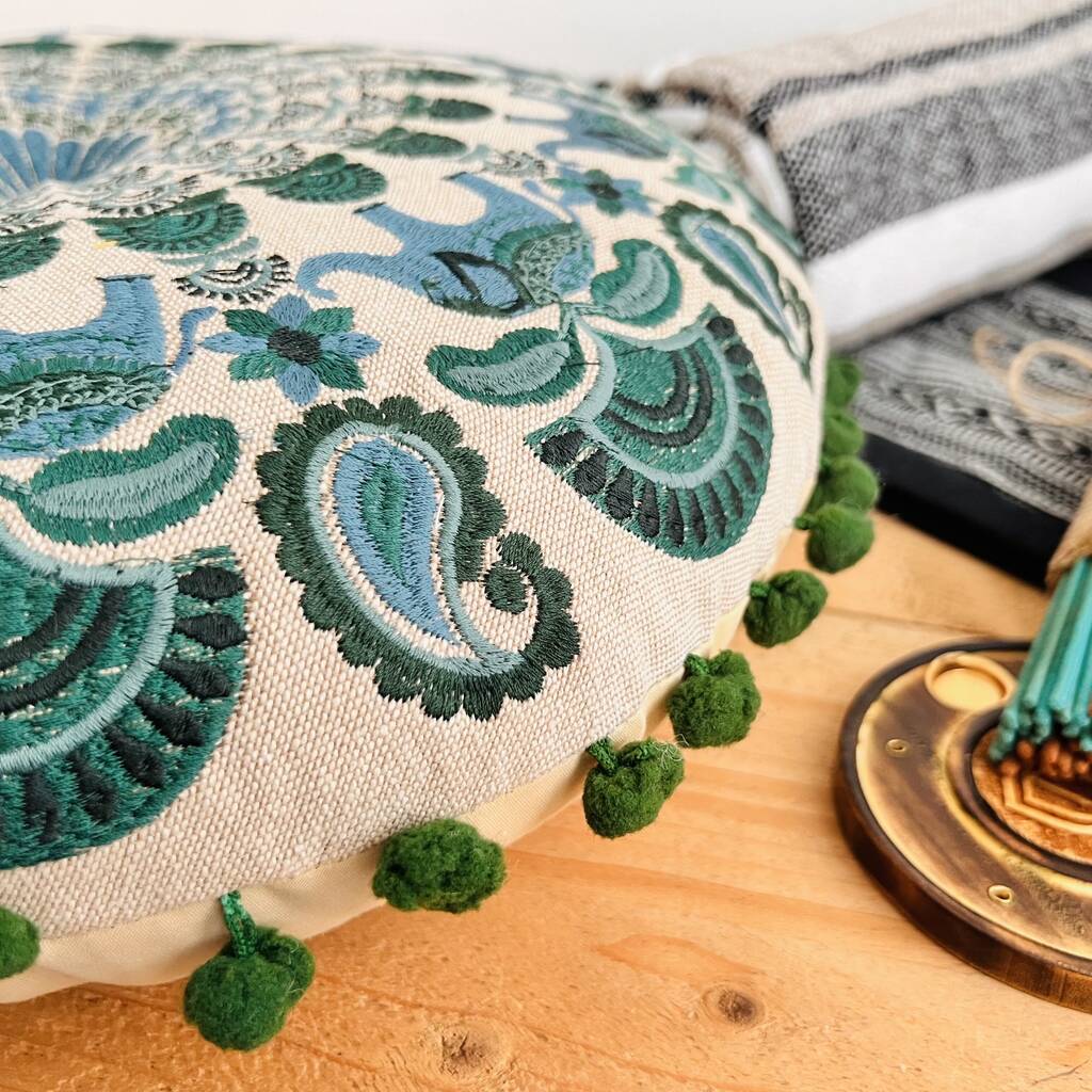 Mandala Meditation Cushion: Intricately designed in turquoise and teal, representing clarity, balance, and emotional harmony.