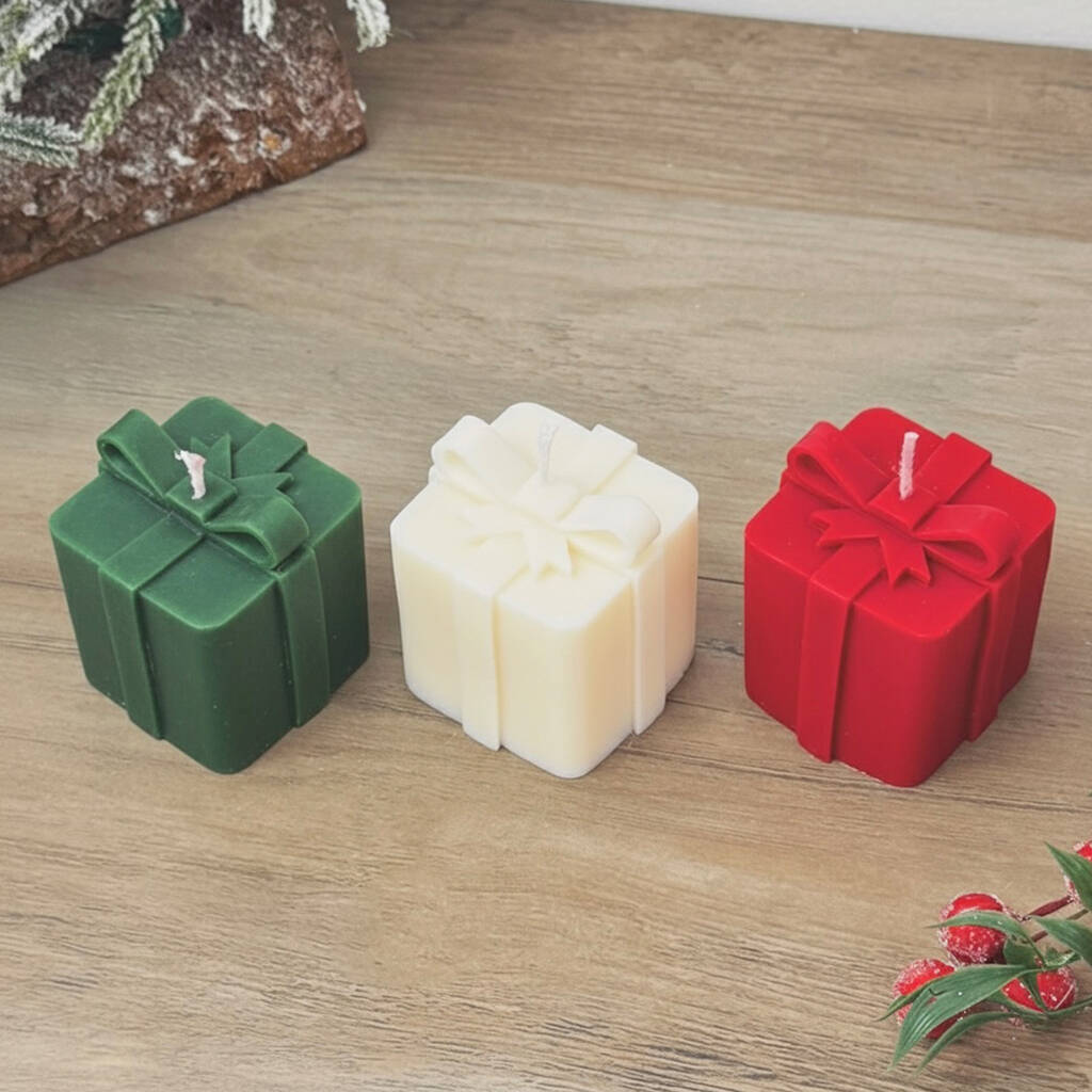 Our Christmas gift box candle comes in 3 festive colours and features a Christmas present shape. This festive candle makes a lovely stocking filler gift or Christmas decoration candle.
