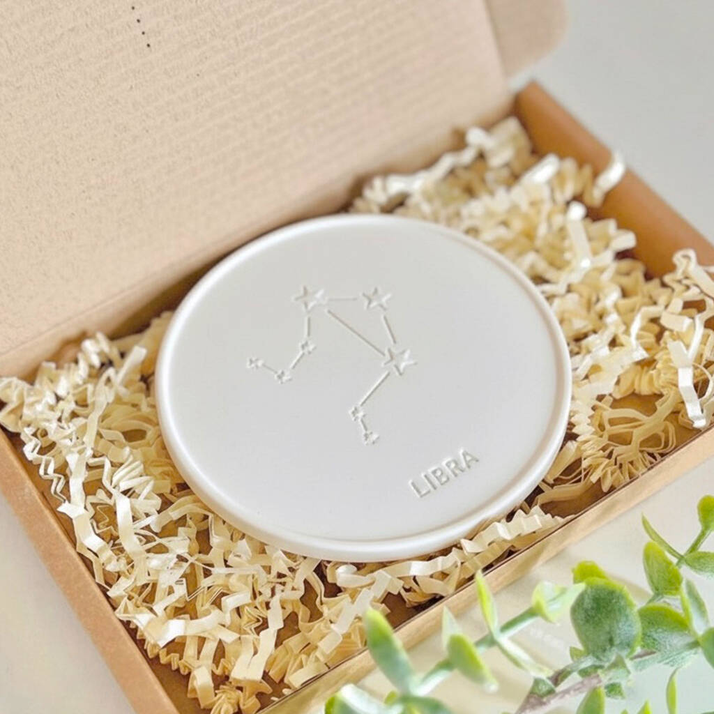 Our handmade Libra star sign coaster makes a thoughtful September or October birthday gift. Featuring the Libra star sign constellation and zodiac name, this unique drinks coaster is crafted from eco-friendly jesmonite, a sustainable alternative to resin with a beautifully smooth finish.