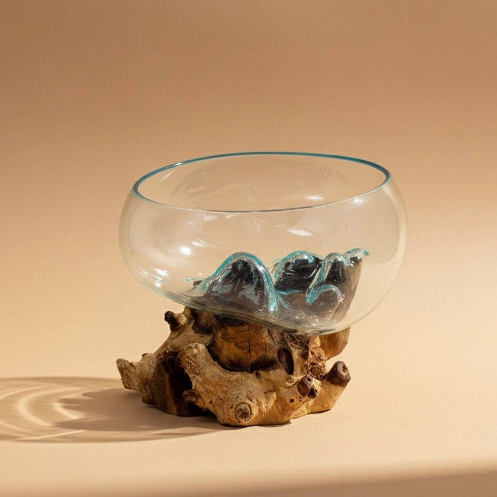 Handmade molten glass bowl on sustainable Balinese wood, a unique eco-friendly centrepiece perfect as a fruit bowl, succulent planter or gift for home décor lovers.