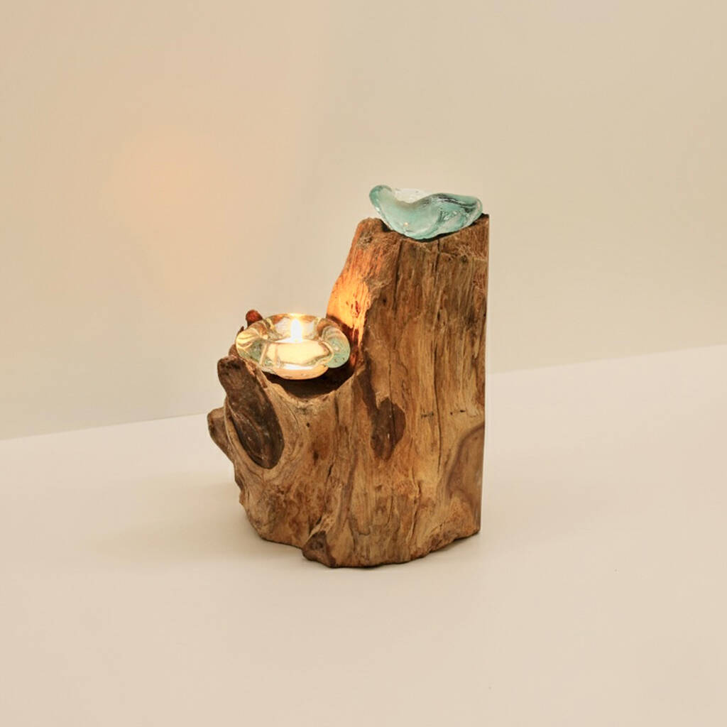 The molten glass is hand-blown to flow seamlessly over the natural wood, creating a secure fit for the tealight holders and blending the contemporary and with rustic. Ideal for holding a two tealight candles, this melted glass candle holder adds a calming glow to any space.