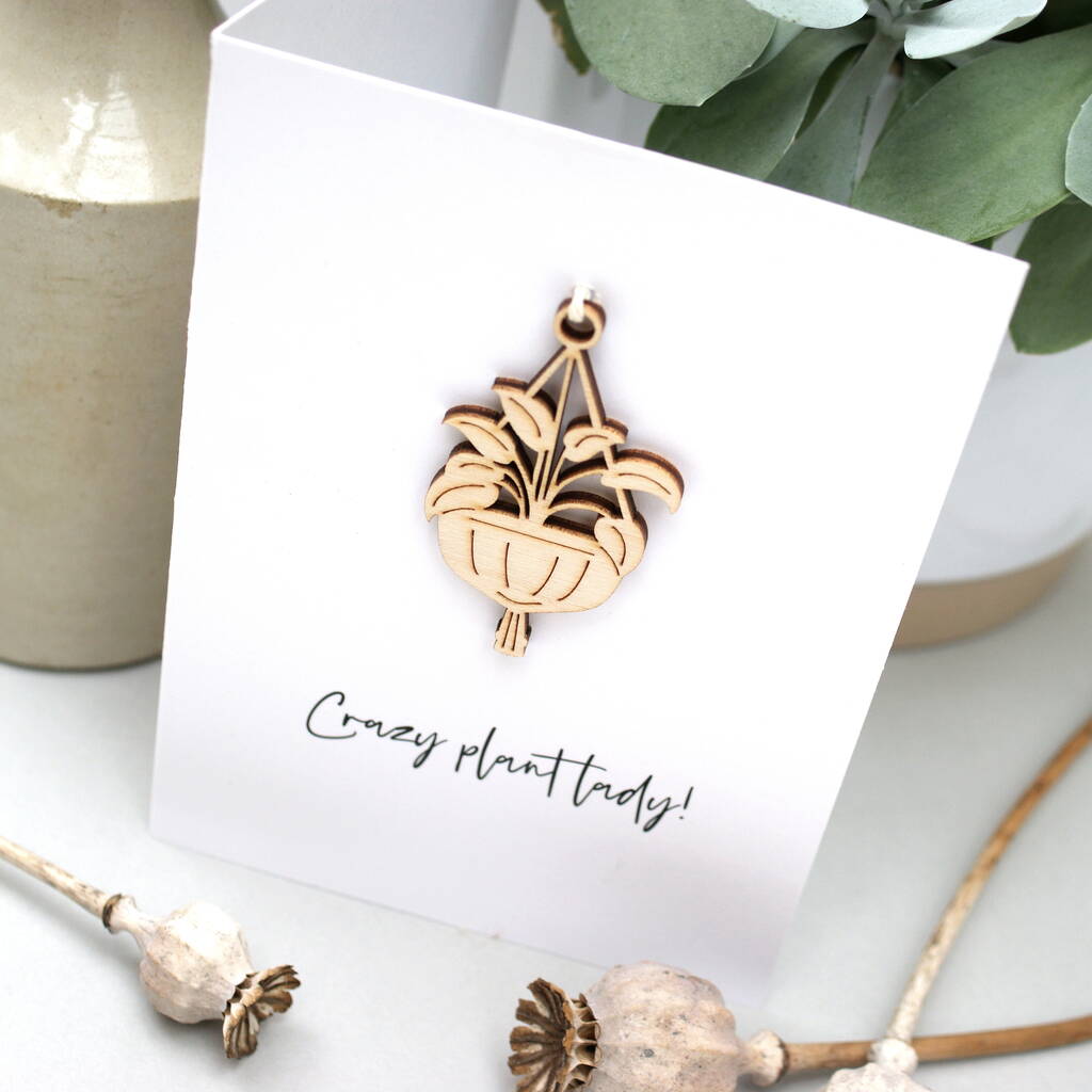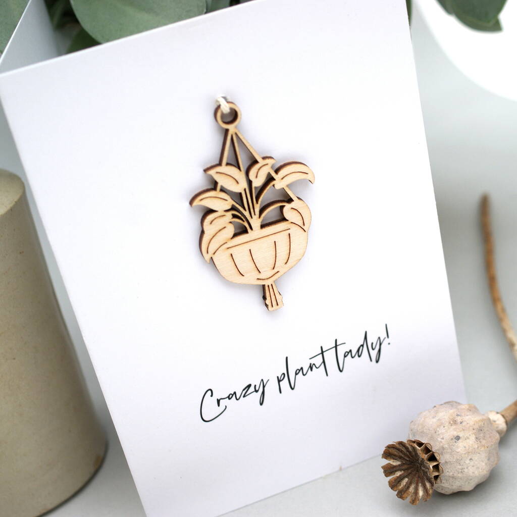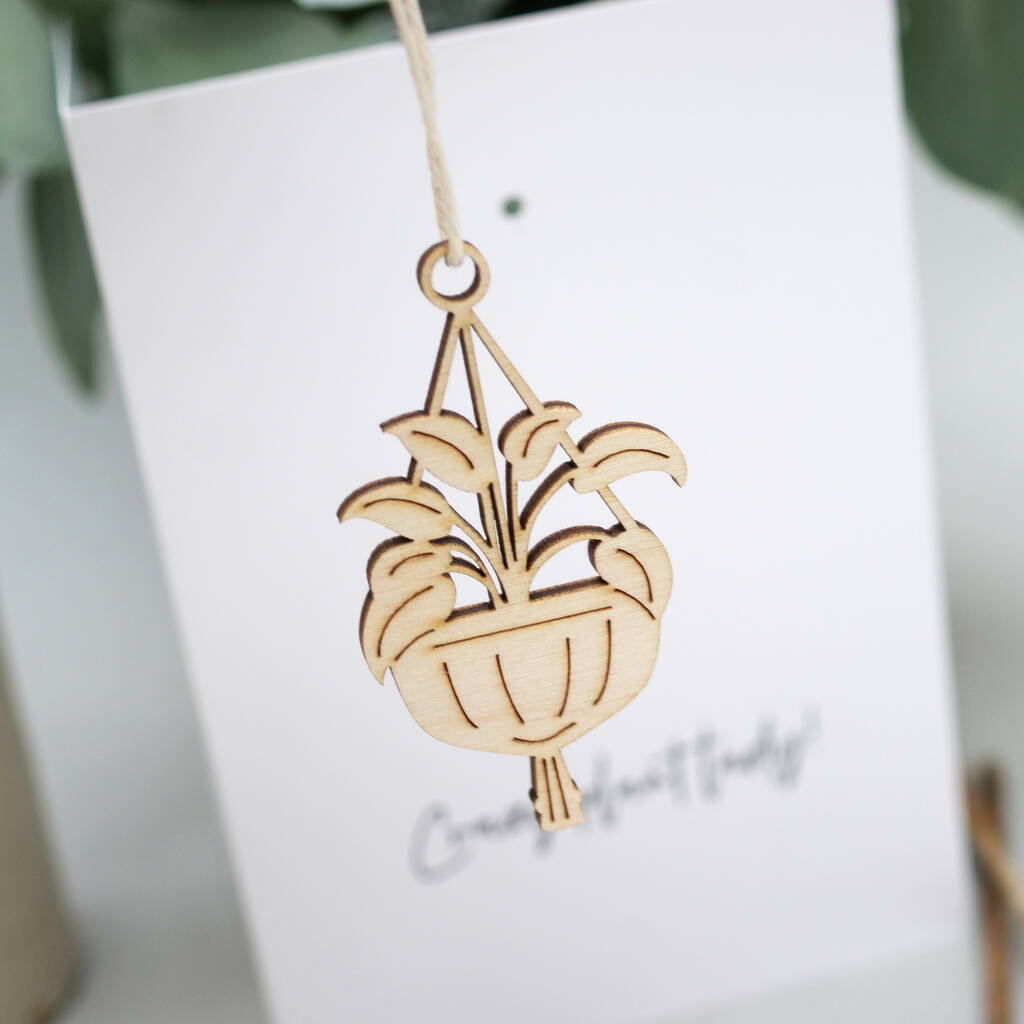 This cute card features a gorgeous laser cut wooden hanging plant. The cute plant charm can be taken off and kept as a little keepsake too.