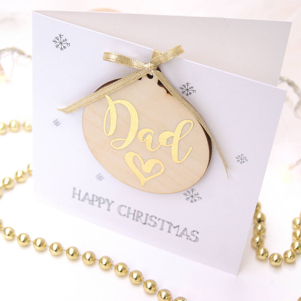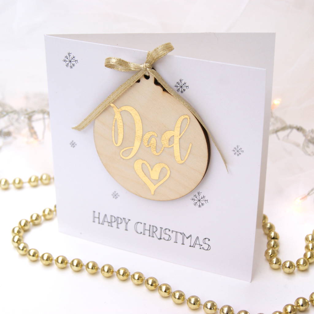 This unique card is designed with a laser cut wooden bauble printed in gold foil with your choice Dad or Daddy.
