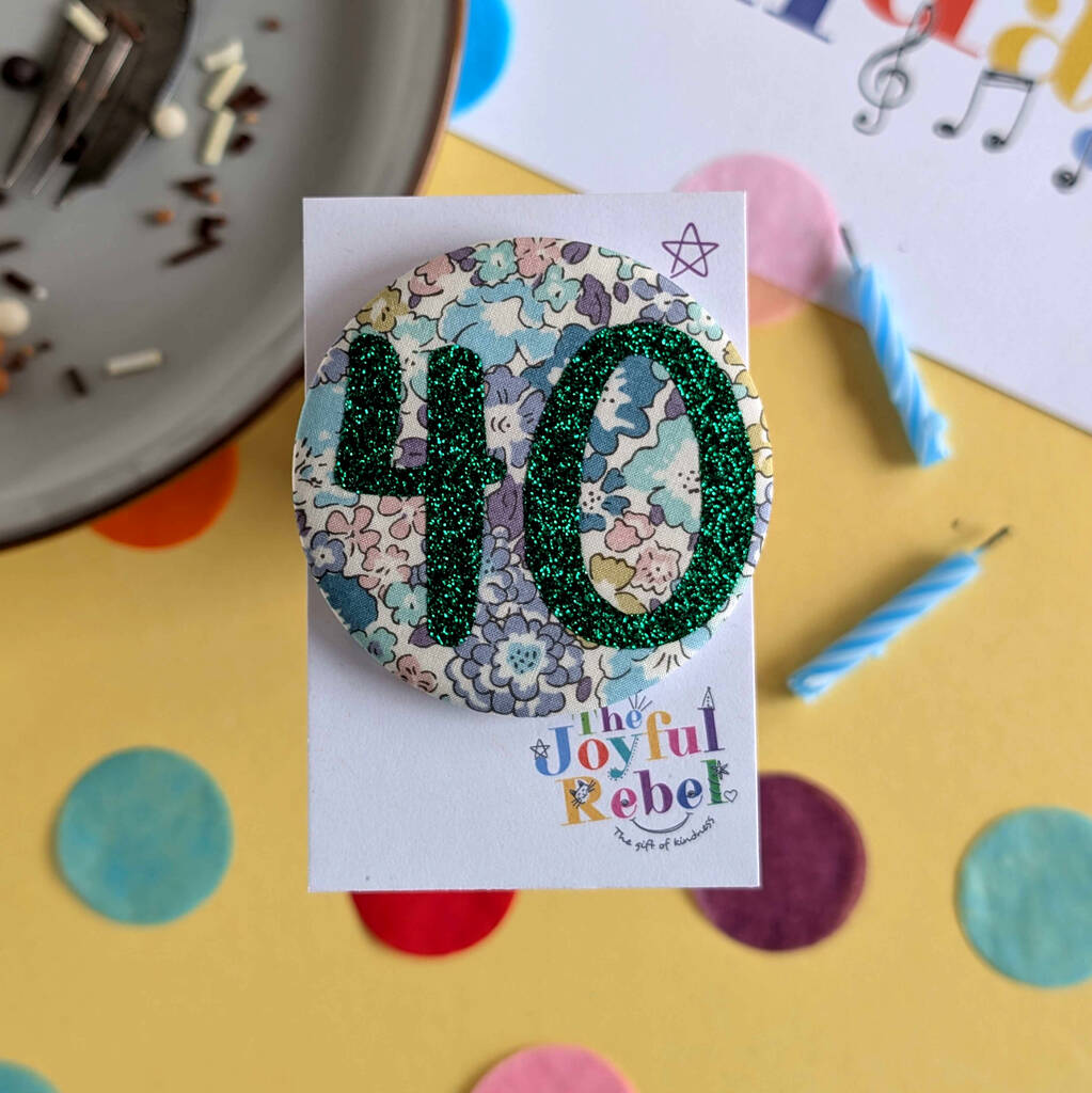 This birthday badge is designed primarily as a special occasion accessory and keepsake rather than an everyday wearable item. To keep your badge looking its best, we recommend gentle care. If cleaning is required, lightly spot clean the fabric surface using a soft, dry or slightly damp cloth. Avoid rubbing the glitter or number detail to prevent lifting or dulling the finish. Do not machine wash, soak, tumble dry, or iron the badge, as heat and moisture may damage the fabric, adhesive, or backing. When not in use, store the badge flat in a dry place away from direct sunlight to help preserve the colour and pattern of the fabric, including Liberty print designs, and to maintain the sparkle of the number detail.