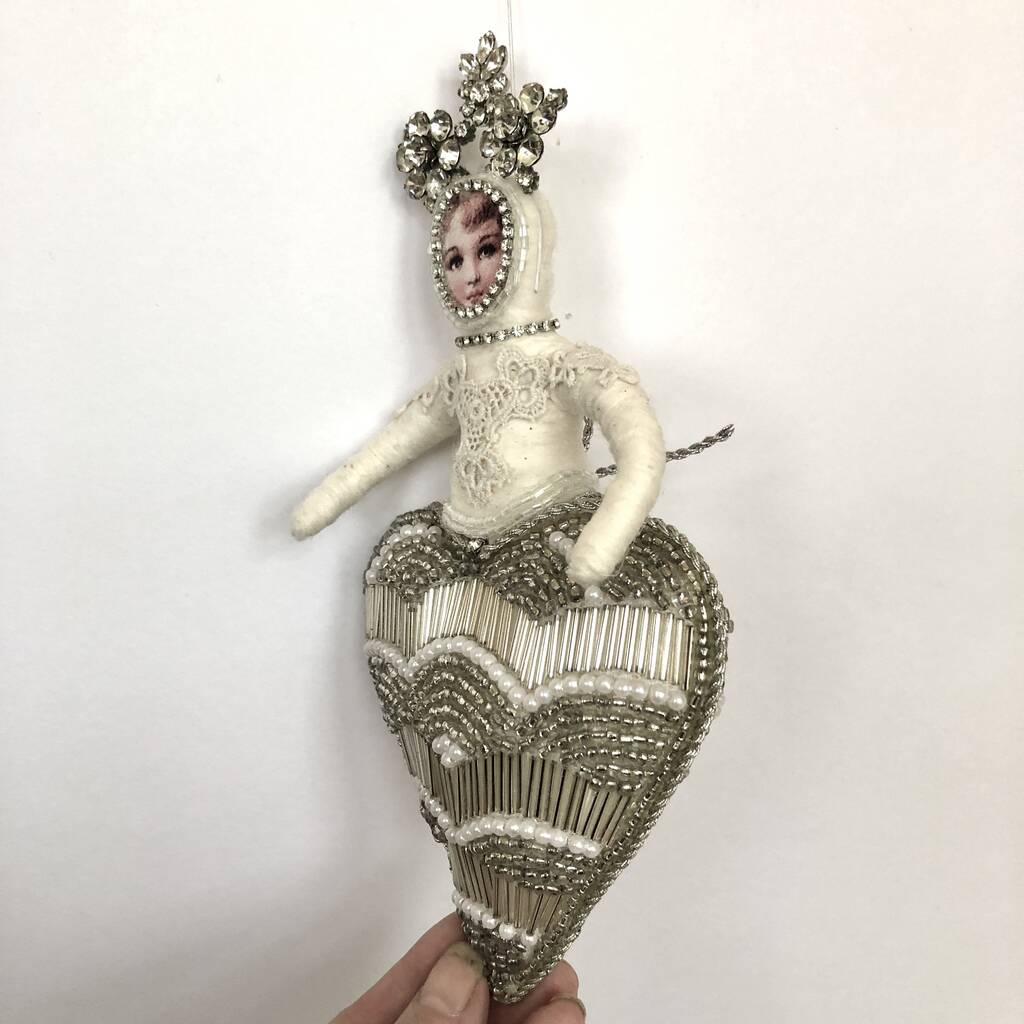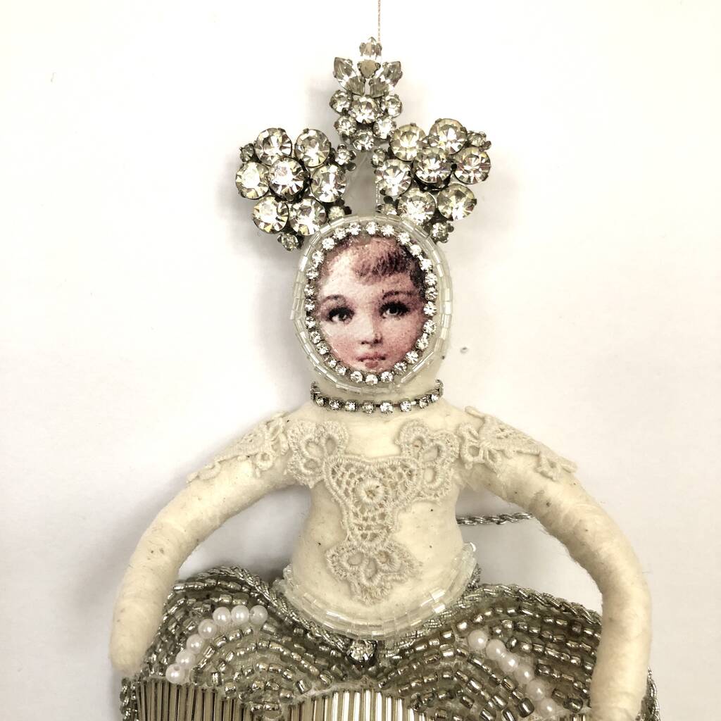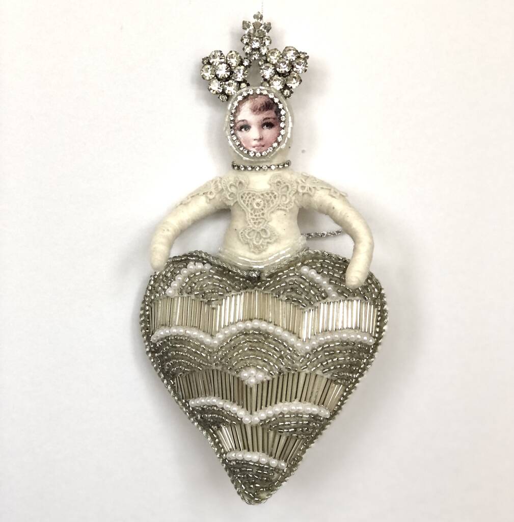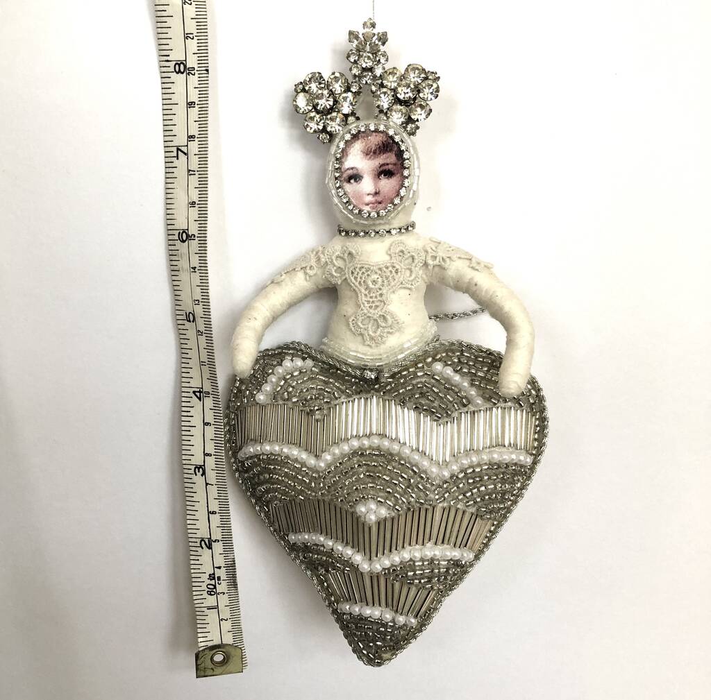 This individual piece " Pearl" is made from Spun Cotton Roving. a padded glass beaded heart body. The rest of her is embellished with recycled vintage lace, diamante pieces, trim, faux pearls, glass beads and a printed paper face.