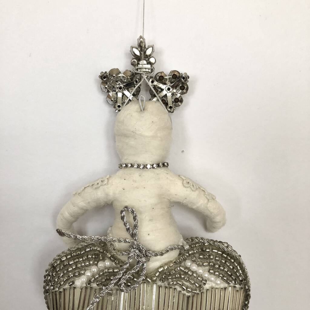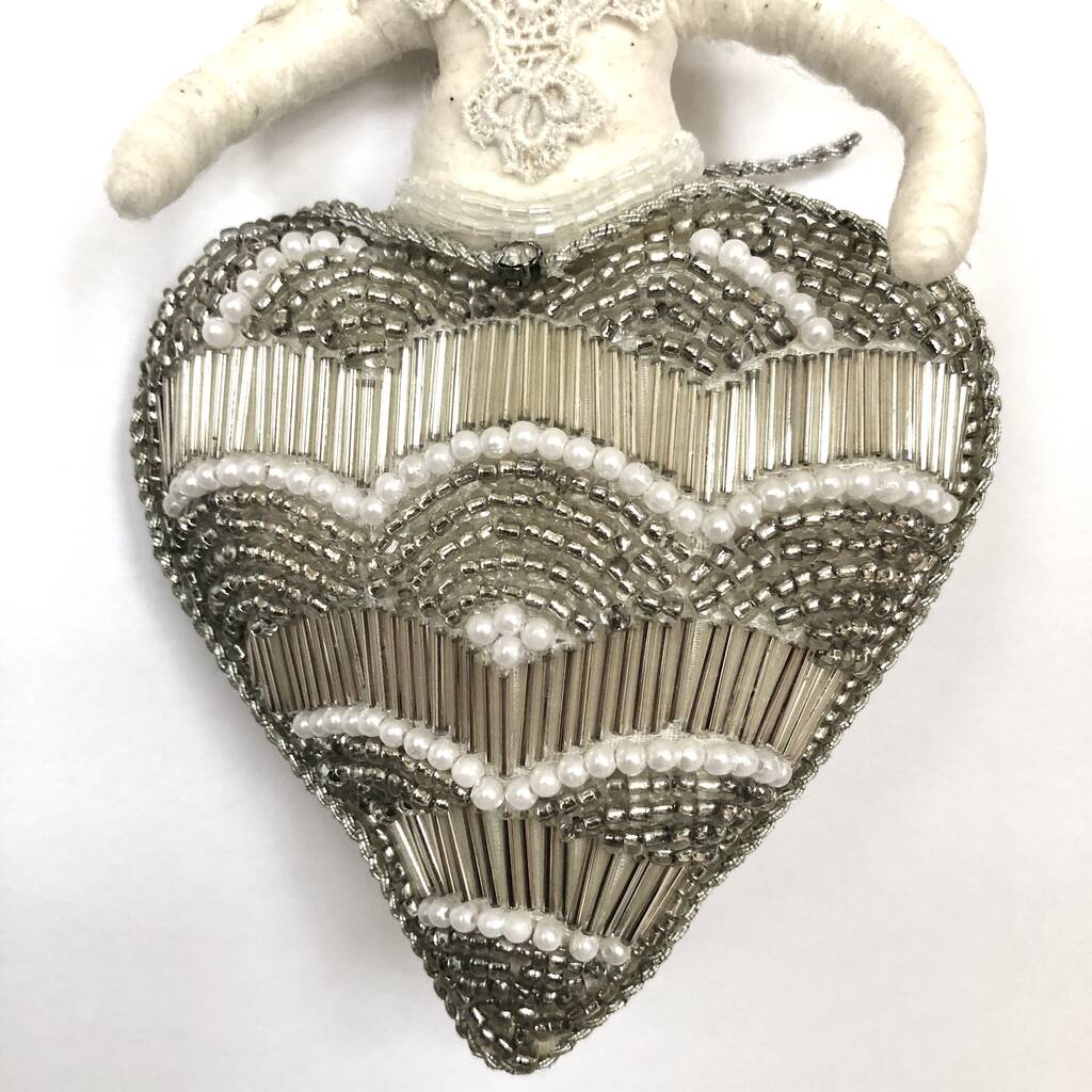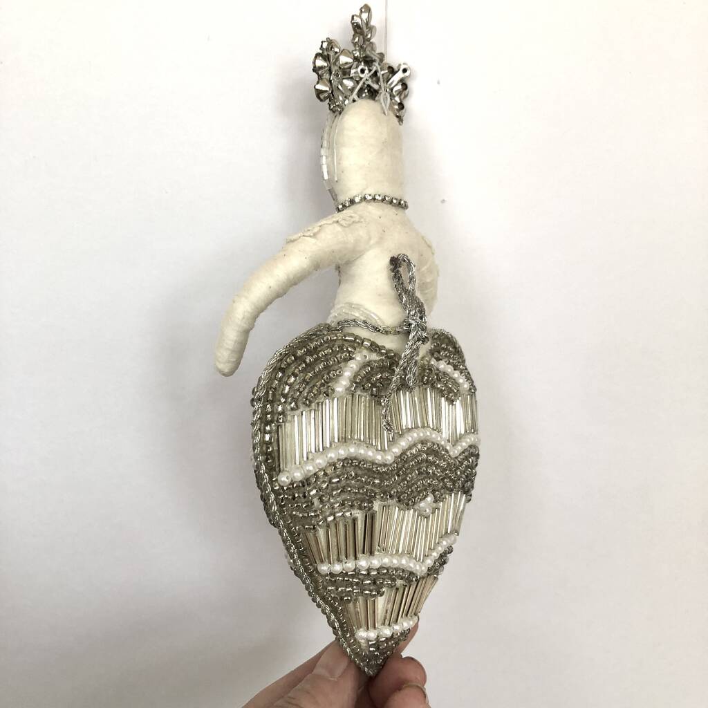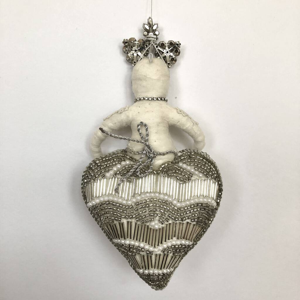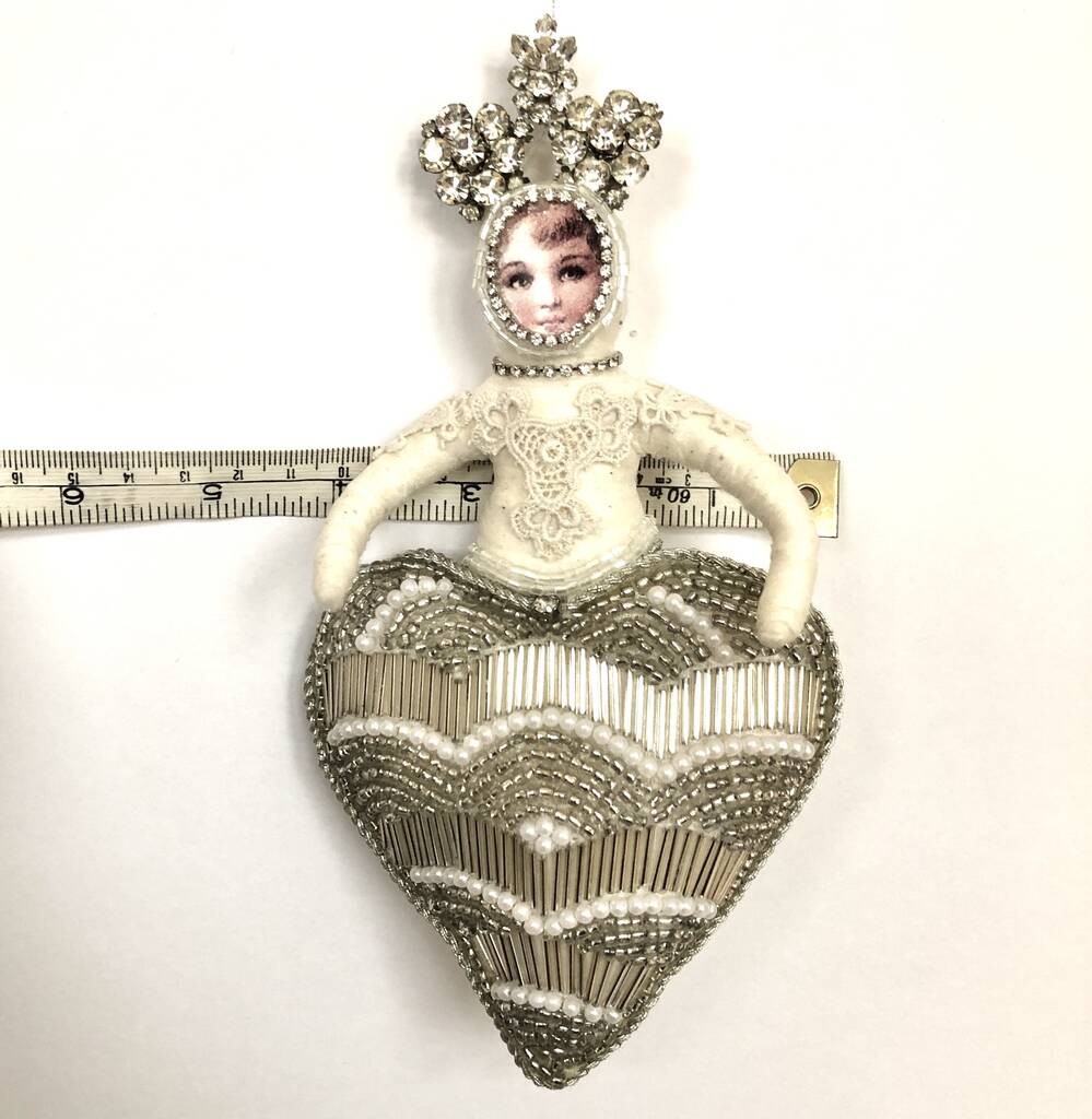 This individual piece " Pearl" is made from Spun Cotton Roving. a padded glass beaded heart body. The rest of her is embellished with recycled vintage lace, diamante pieces, trim, faux pearls, glass beads and a printed paper face.