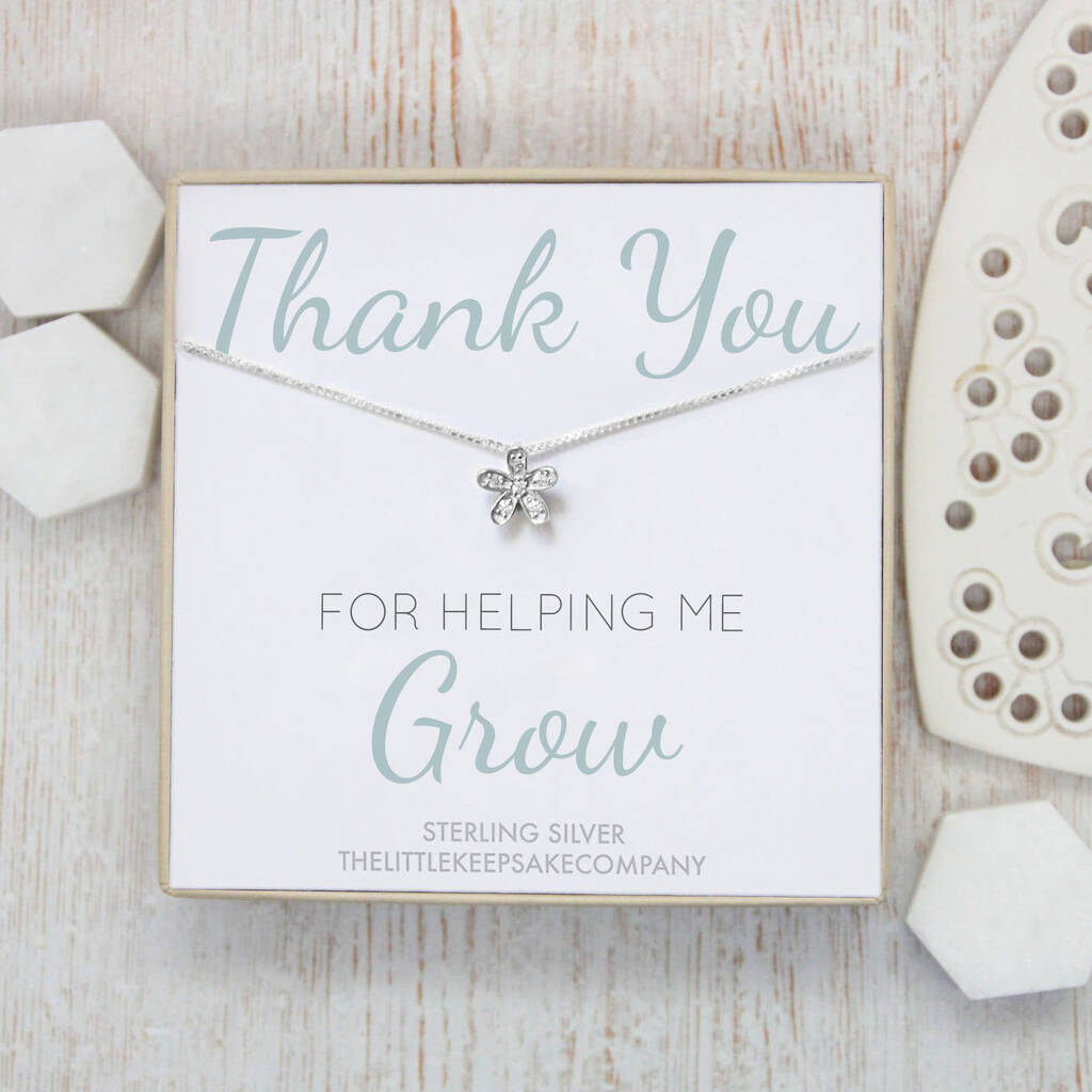 Whether it’s for a favourite teacher, a lovely teaching assistant or perhaps a special friend, this sweet silver flower necklace is a thoughtful way to show how much you appreciate their support with the message; Thank You For Helping Me Grow.