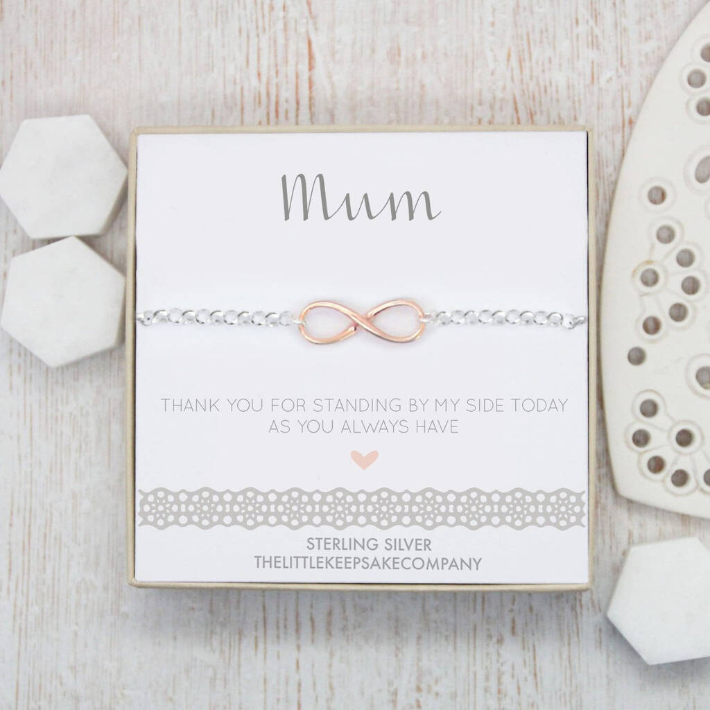 Celebrate eternal love with our beautiful silver and rose gold infinity bracelet. Our stunning slider bracelets are the perfect way to thank your amazing Mum for being by your side on your special day with the message; Mum, Thank You For Standing By My Side Today As You Always Have.