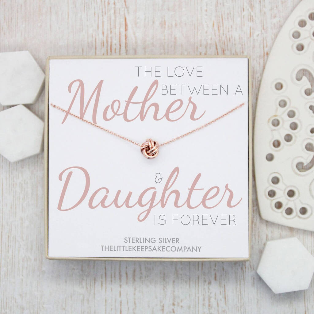 You’ll be there for each other no matter what and share a love that means you are always by her side in a heart beat. This pretty rose gold knot necklace is a special way to let her know how much you care with a message straight from the heart; The Love Between A Mother & Daughter Is Forever.