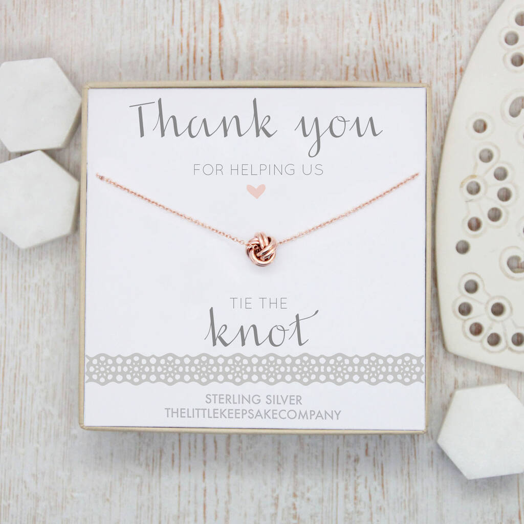 It’s official, you’re tying the knot! Our stunning rose gold vermeil knot necklaces are the perfect way to thank the incredible women in your life for being by your side on your special day with the message; Thank You For Helping Us Tie The Knot.