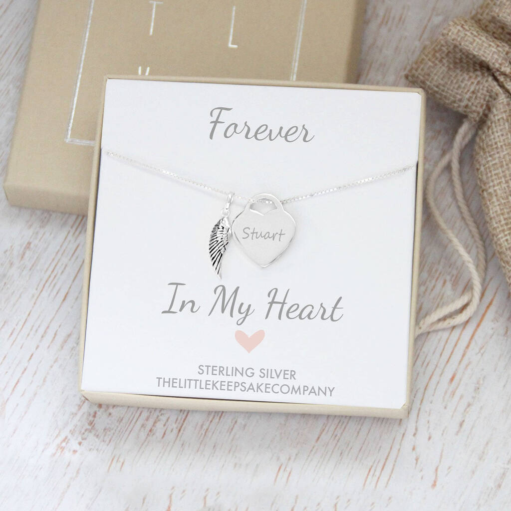 This beautiful silver necklace combines a silver heart charm which can be engraved with a loved one’s name, alongside a pretty oxidised wing charm with the message; Forever In My Heart.