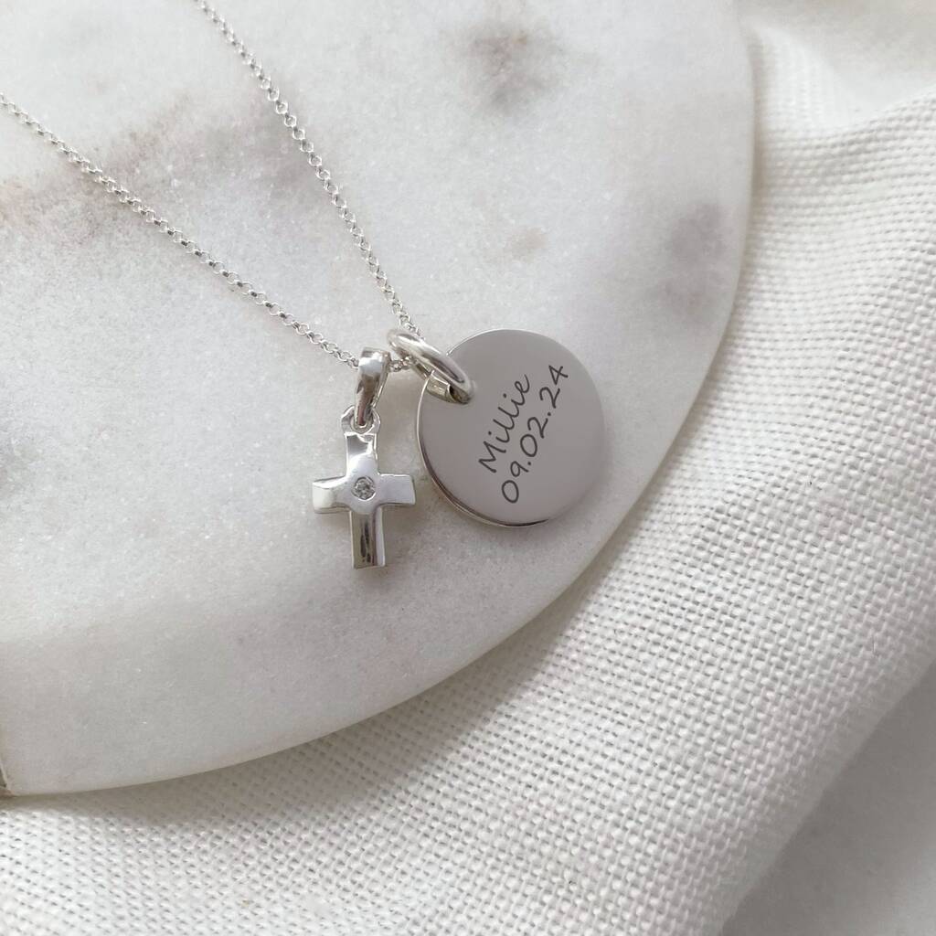 Silver Junior Crucifix Necklace, Personalised Mini Disc