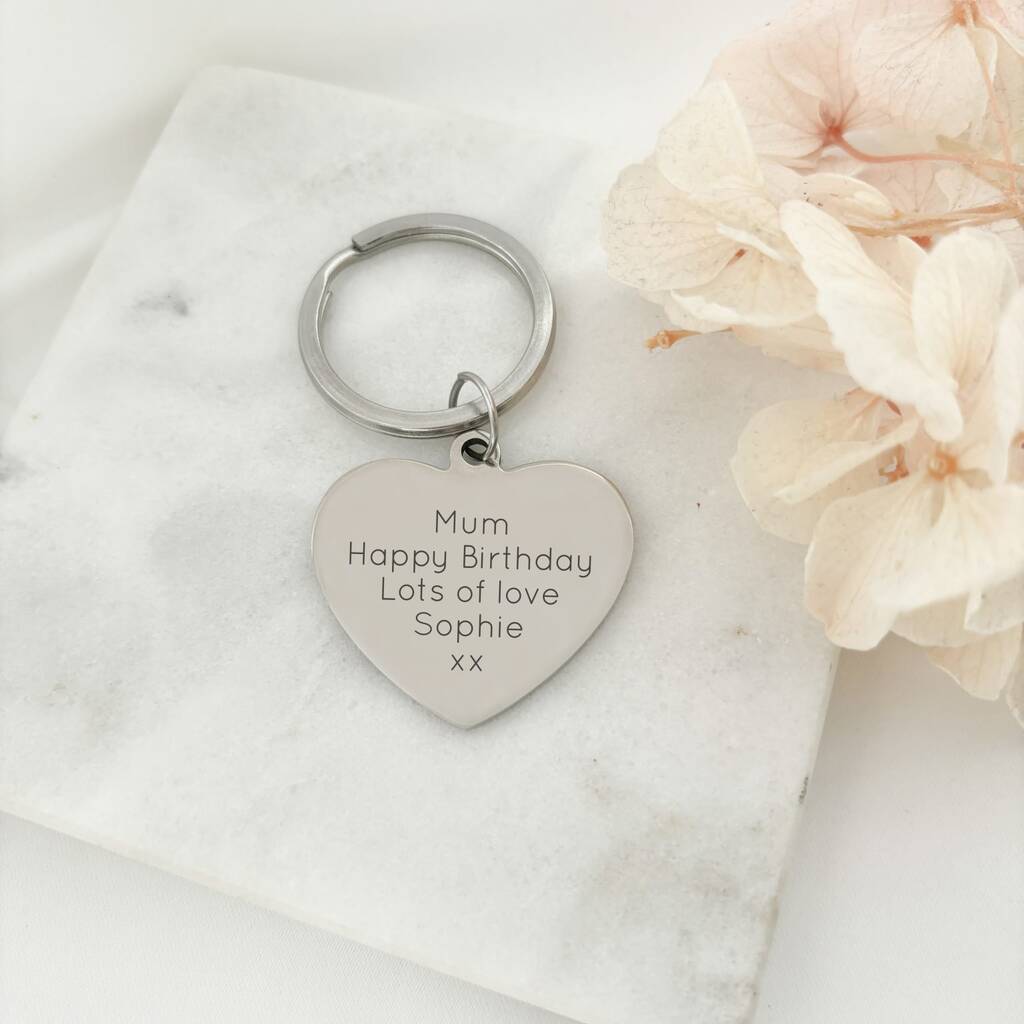 Stainless Steel Engraved Birth Flower Heart Keyring