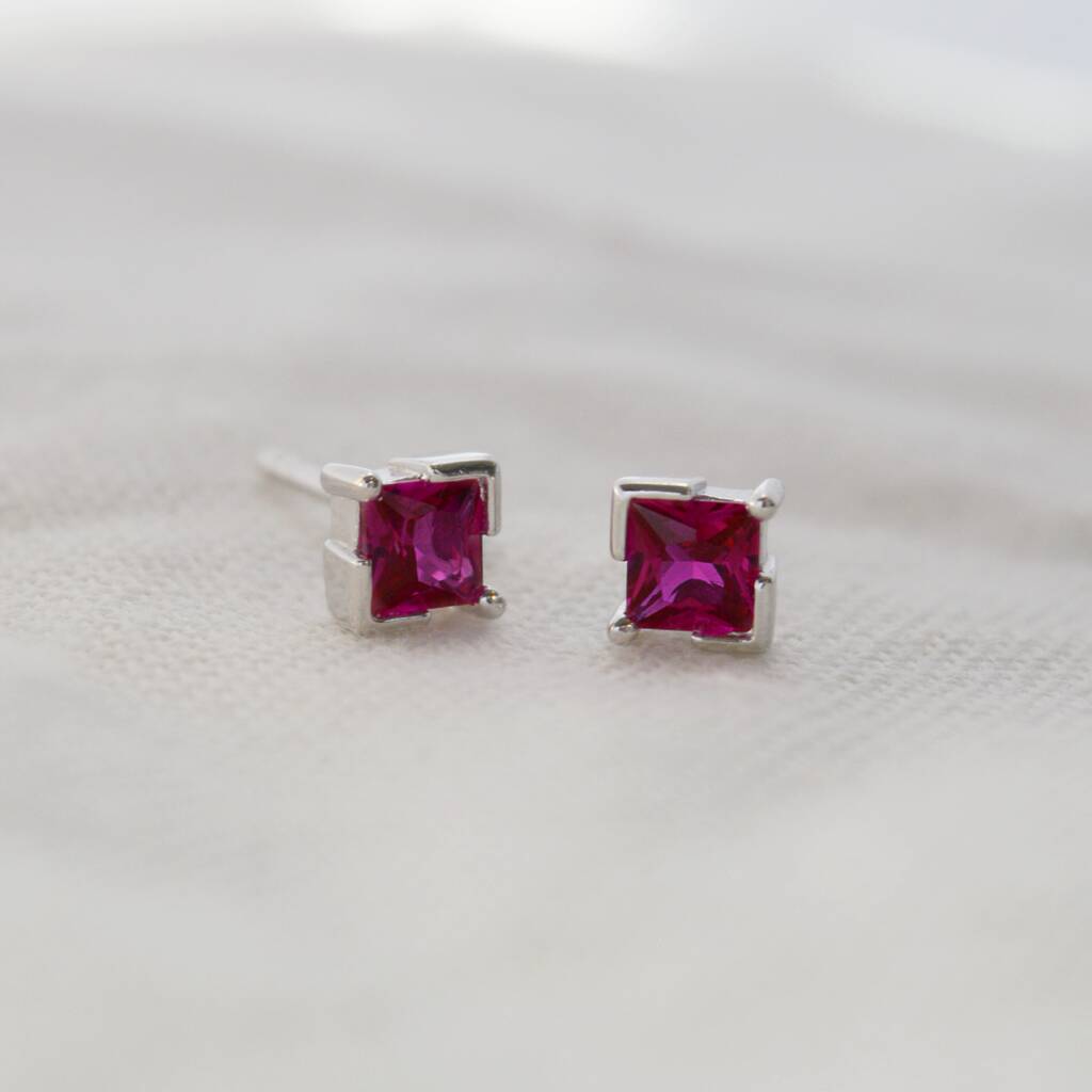 A set princess cut stone with small ball detail in the style of July's birthstone, Ruby.