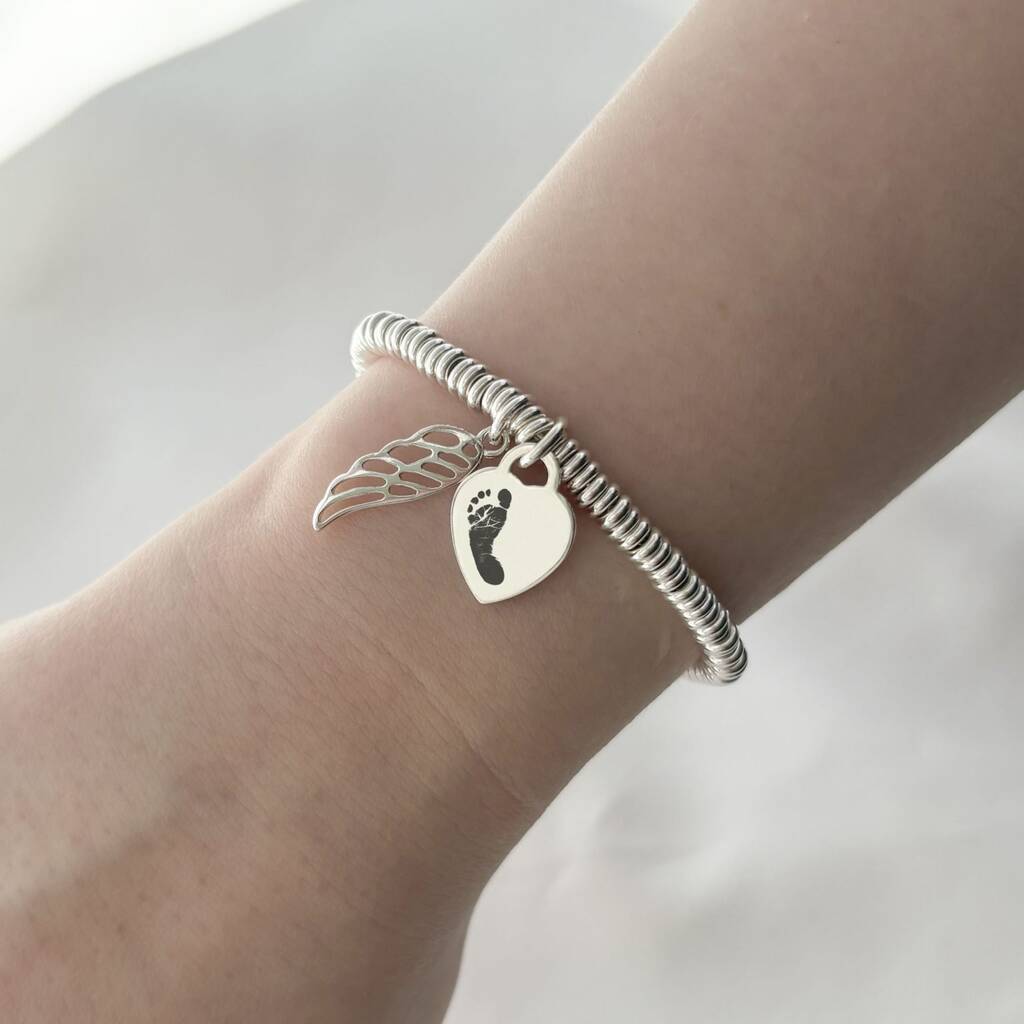 This elegant sterling silver bracelet combines a silver heart charm which can be engraved with your loved one’s hand or foot print, alongside a pretty silver angel wing charm.