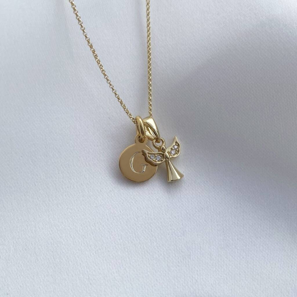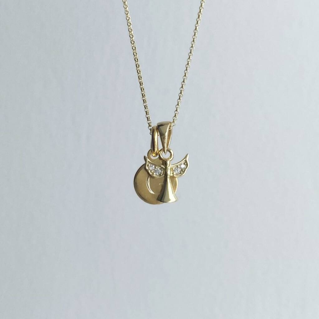 Yellow Gold Cz Angel Necklace With Initial Disc
