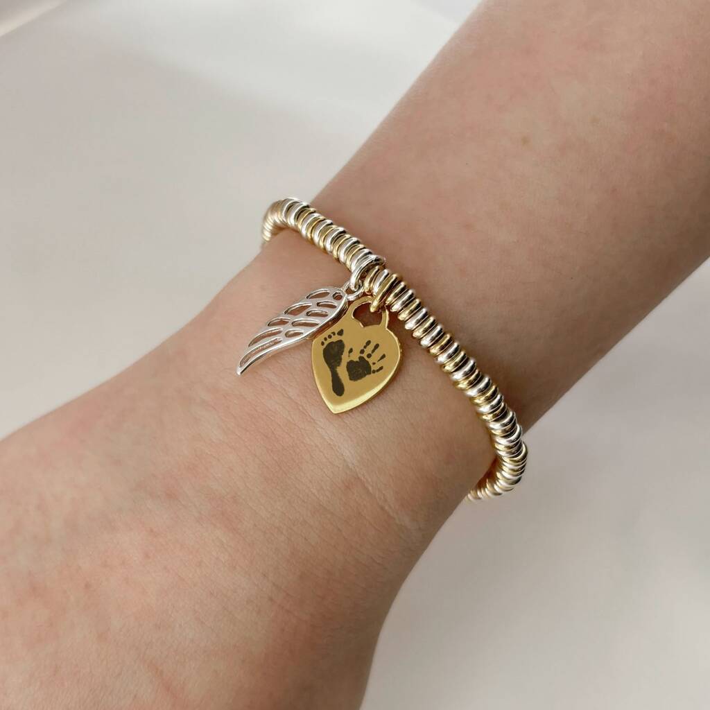 This elegant sterling silver and yellow gold bracelet combines a gold heart charm which can be engraved with your loved one’s hand or foot print, alongside a pretty silver angel wing charm.