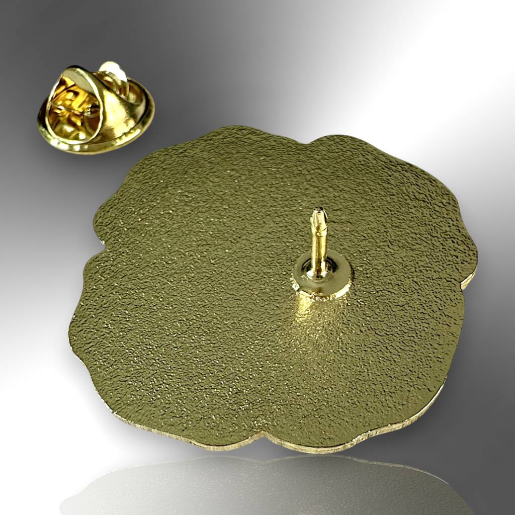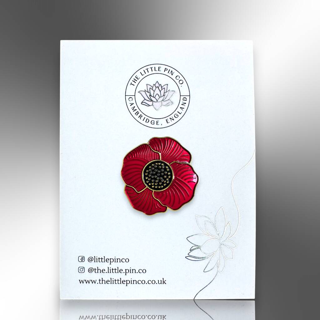 *Please note that because of the reflective nature of this pin, it is very difficult to photograph and in some lights, the poppy will look a much brighter scarlet red and in other lights, a much darker red.