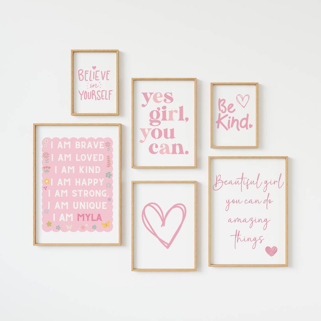 Girls Affirmation Pink Themed Personalised Wall Print Set For Bedroom Or Nursery