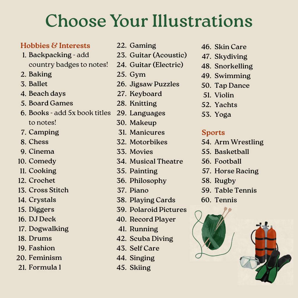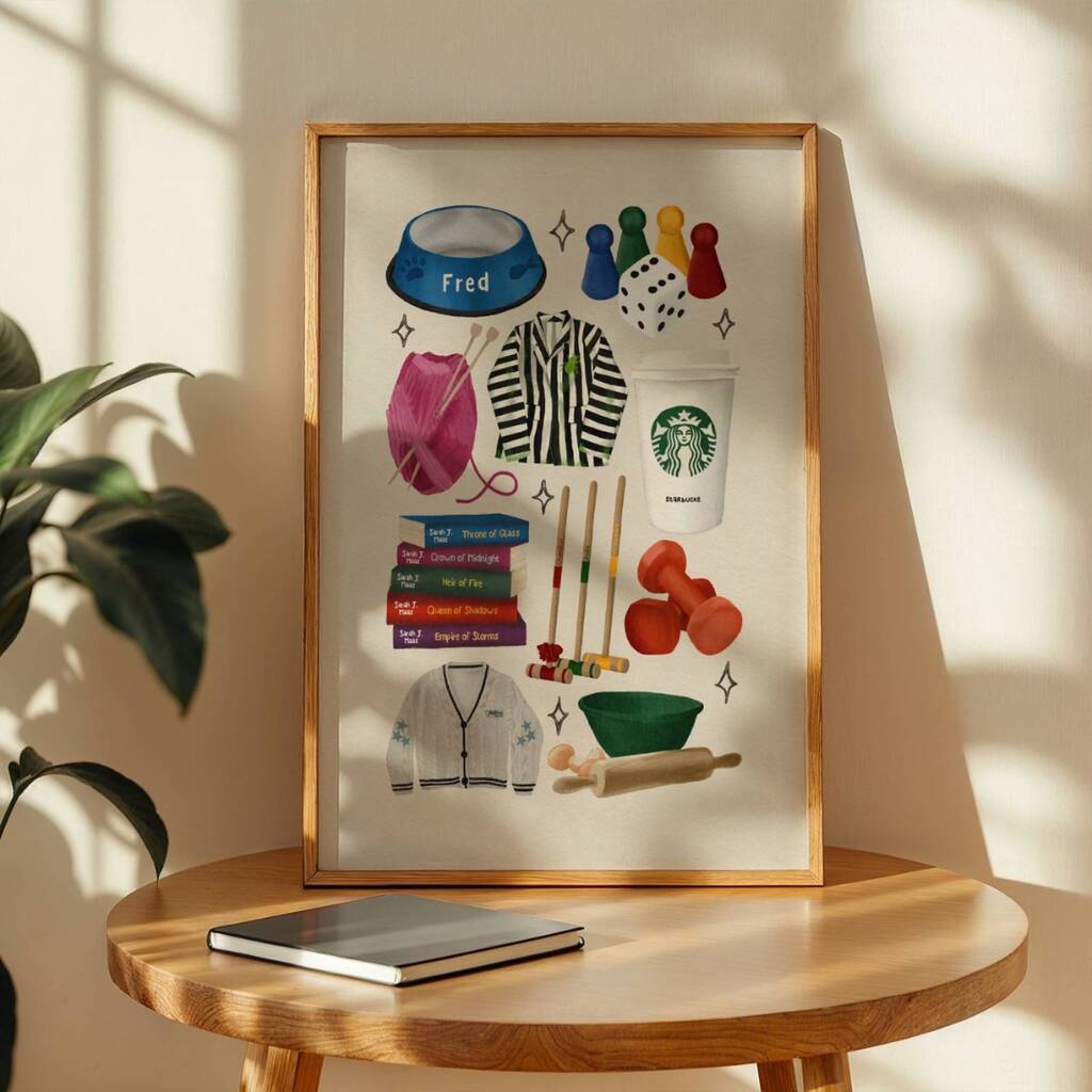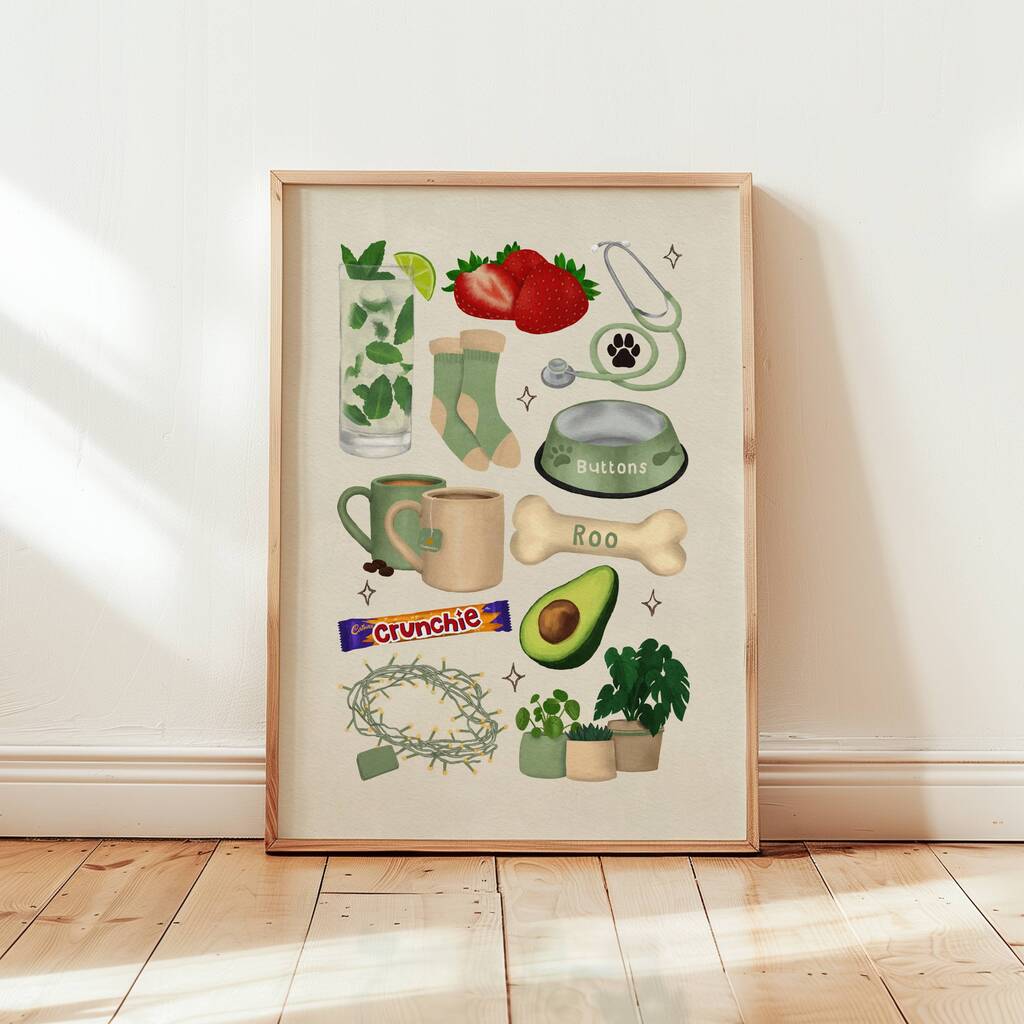 Celebrate life’s little joys with this made-to-order print, featuring your hand-picked selection of gorgeous illustrations. Whether it’s your go-to cocktail, beloved pet, or favourite hobby, this personalised artwork captures everything that makes you, well you, in a stylish and heartfelt way.