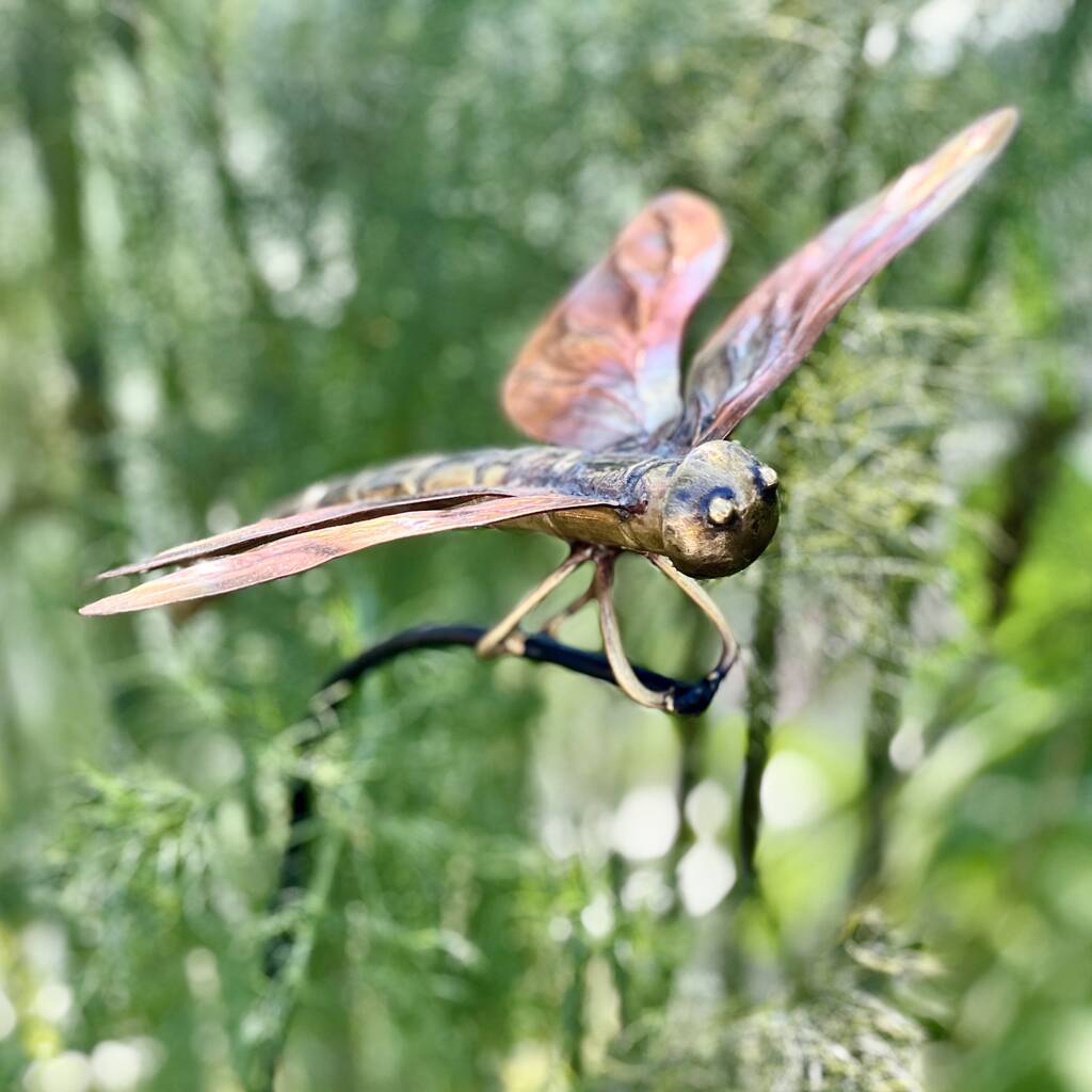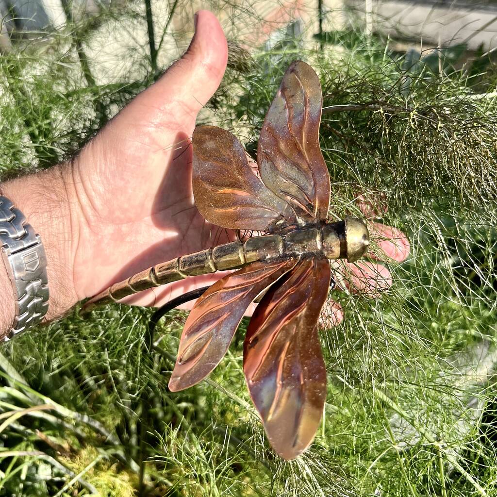 Copper Dragonfly Garden Stake – Outdoor Metal Sculpture – Copper And Brass Insect On Curved Pole