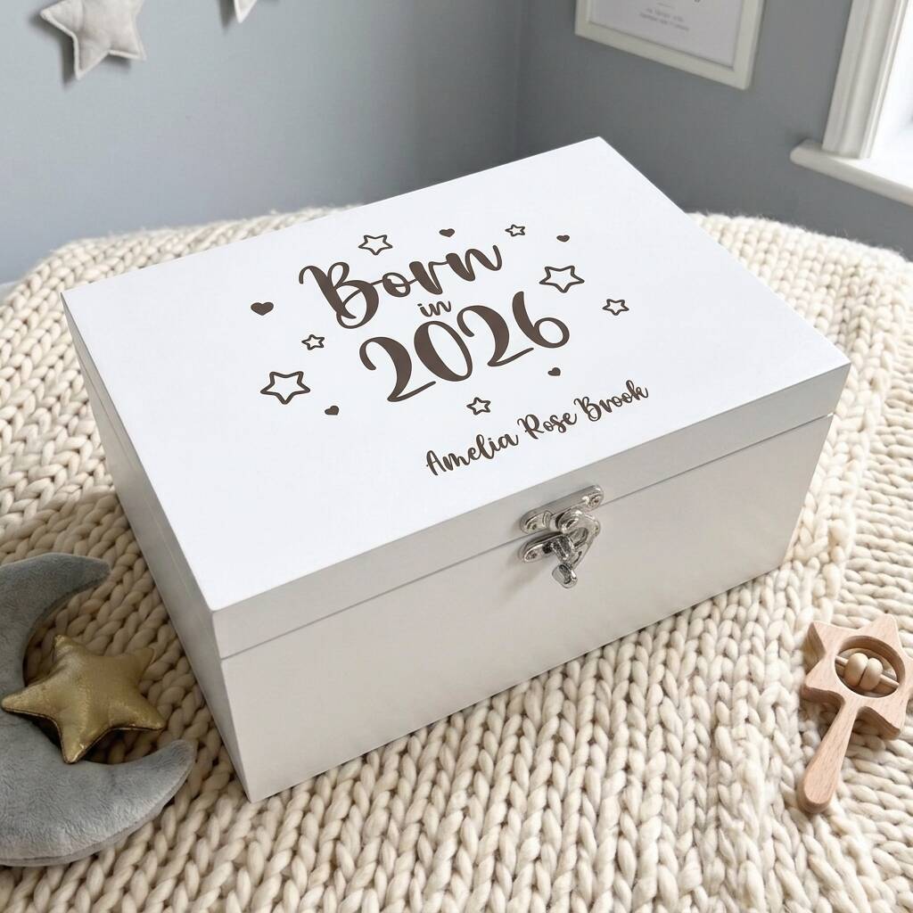 Personalised Born In 2026 Stars Engraved White New Baby Keepsake Box Three Sizes 22cm | 27cm | 30cm