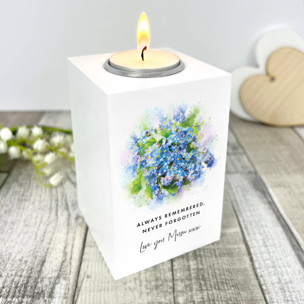 Personalised Forget Me Not White Memorial Tea Light Holder
