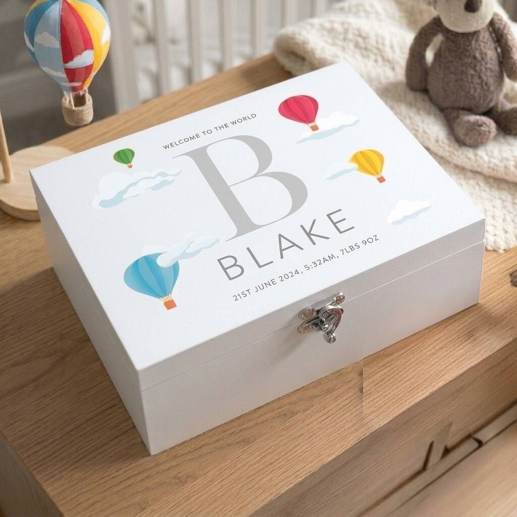 Personalised Hot Air Balloon Baby White Keepsake Box Three Sizes