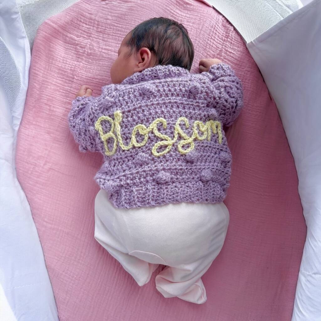 Bespoke baby crochet cardigan, a lovely gift to celebrate the arrival of a new special little one. Personalised with any name of your choice.