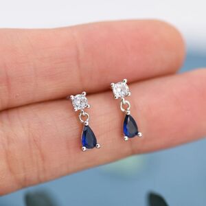 Sapphire Blue Triple Cz Dangle Chain Stud Drop Earrings