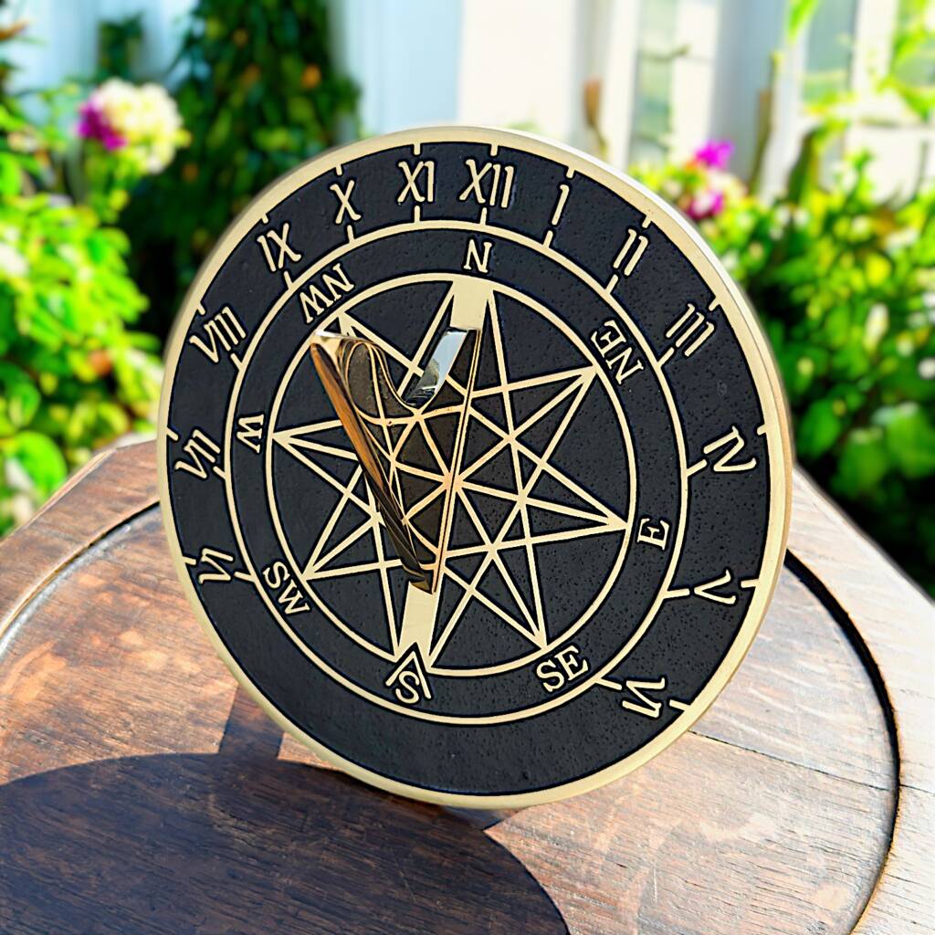 ANNIVESARY ∙ GIFT ∙ SUNDIAL • Material: Premium Quality Solid Recycled Brass • Dimensions: Dial - 6¼” diameter ∙ With gnomon - 3” high • Weight (with gnomon): 816 Grams • The Star Sundial can be installed outside but also comes with an optional display bracket for displaying as an indoor ornament