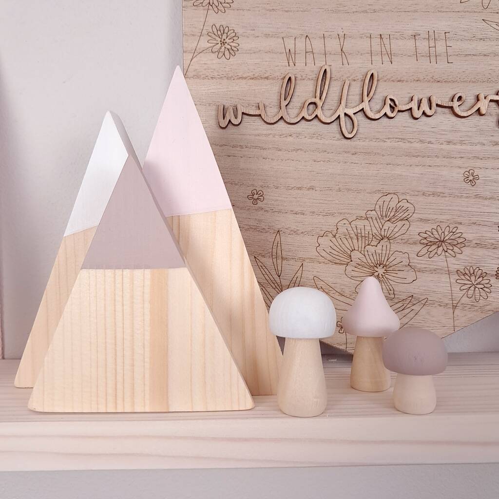 Hand Painted Wooden Mountains And Mushrooms Pink And White