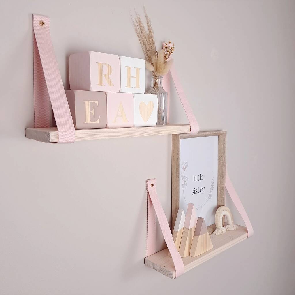Perfect for displaying baby keepsakes, nursery artwork and baby name blocks, these shelves help you create a charming focal point. The items shown in our photos can all be purchased from our main shop page to help you recreate the look or design your own.