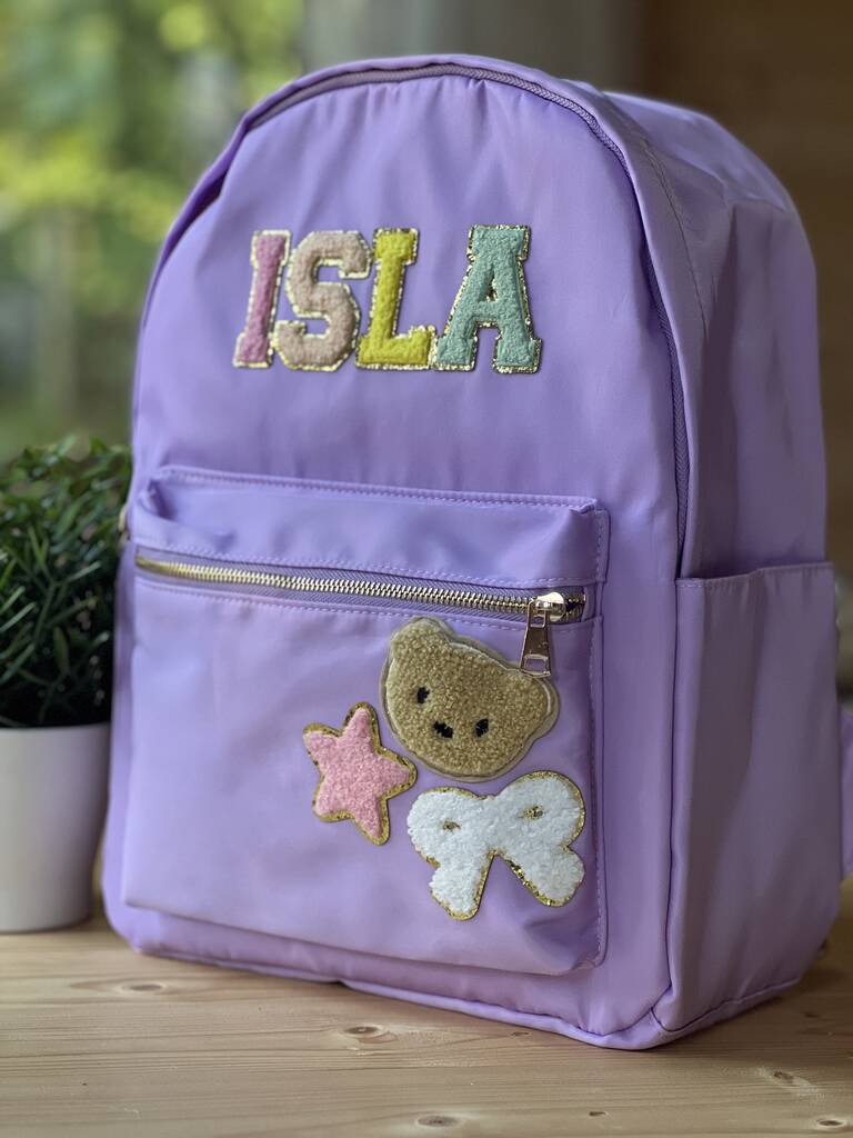 Personalised Nylon Backpack With Patch Letters And Motifs With Gold Outline