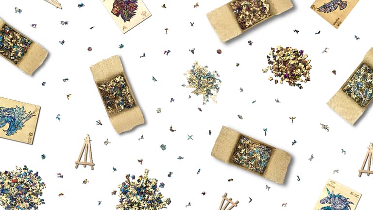 Each wooden jigsaw puzzle includes unique 'Whimsical' pieces that fit perfectly into the puzzle! All packaging is 100% plastic free, plus the pieces come wrapped in a hemp cloth for protection. The intricate puzzle pieces make for a challenging but incredibly satisfying puzzle.