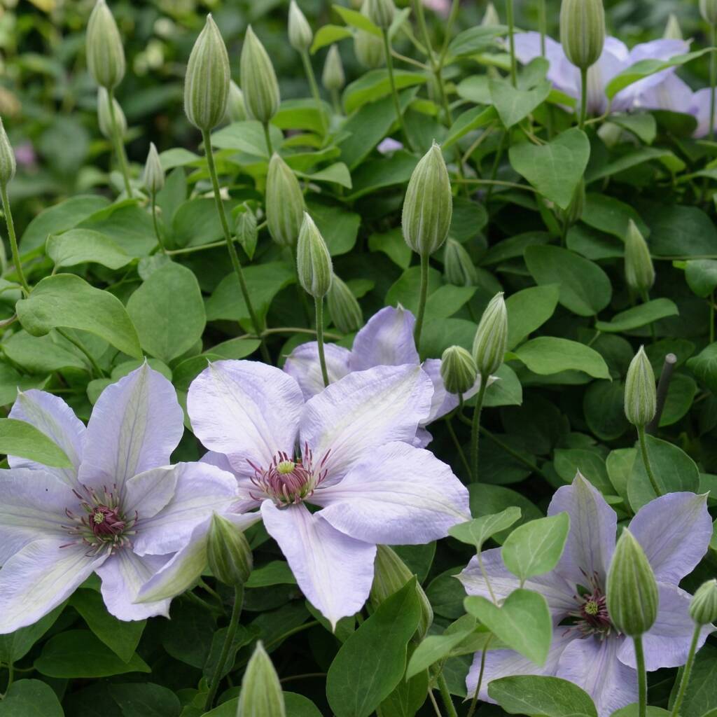 Clematis ‘Bernadine’ typically reaches a mature height of approximately 1.2–1.5 metres, with a spread of around 60–80cm. Its large, single flowers measure up to 12–15cm in diameter and are produced continuously from early summer through to early autumn. The plant’s compact, bushy habit makes it ideal for containers, small trellises, low fences, and obelisks. Its manageable size allows it to provide vertical interest without dominating surrounding plants, making it particularly suitable for patios, balconies, courtyards, and front-of-border planting schemes.