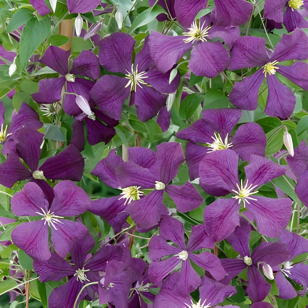 ‘Etoile Violette’ is a medium to large climber, typically reaching 2.5–3 metres in height with a spread of 1.5–2.5 metres. Individual flowers measure 7–10cm across, appearing in clusters that provide a dense summer display. As a viticella-type clematis, it is naturally vigorous yet manageable, making it suitable for climbing over existing shrubs, trees, walls, or trellises. Its rapid growth habit ensures that a mature plant will produce a full cascade of blooms each year, offering long-lasting colour with minimal pruning. The plant thrives in sunny to partially shaded conditions, performing reliably in a wide range of soils, and is especially suited to cottage gardens, mixed borders, or large containers where its cascading blooms can be fully appreciated.