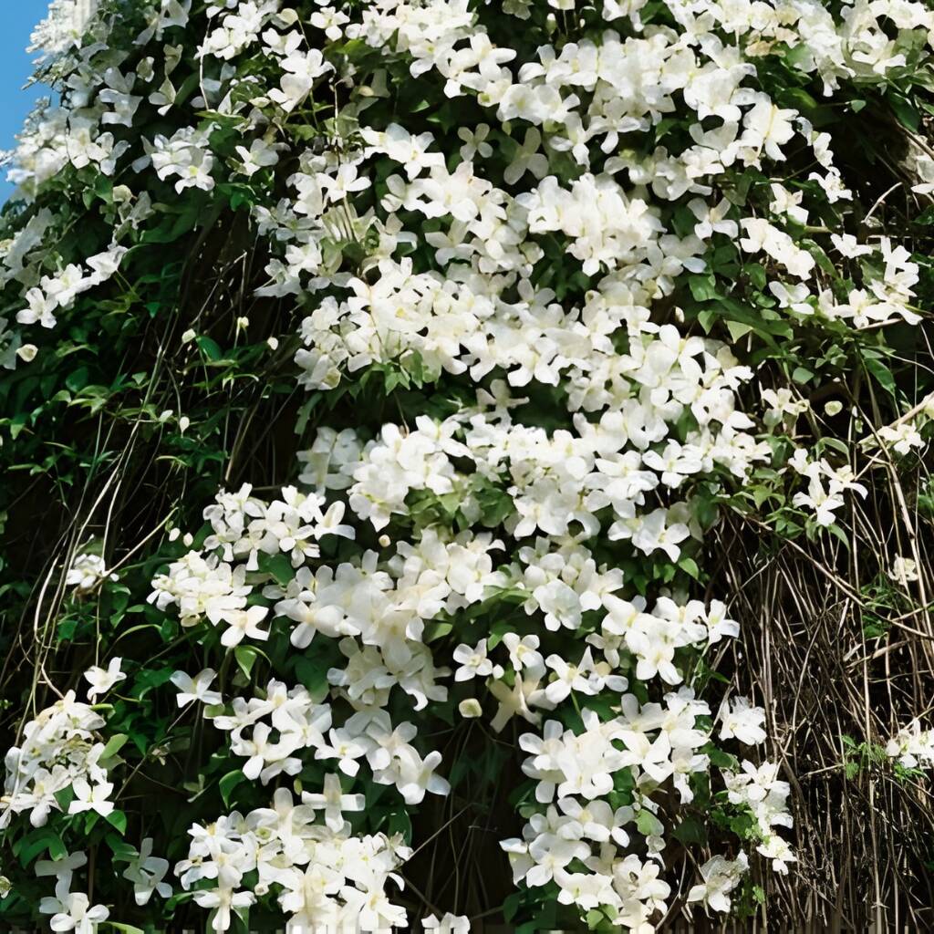 Clematis montana ‘Alba’ can reach heights of 6–12 metres, with a spread of 3–6 metres, making it perfect for large walls, fences, pergolas, or trees. The four-petalled star-shaped flowers measure approximately 3–5cm across and appear in dense clusters from late spring to early summer, creating a dramatic “blanket of white” effect. As a vigorous climber, it quickly covers surfaces, providing rapid screening and a romantic, cascading display. Its deciduous habit ensures that while the foliage may die back in winter, the plant re-emerges with renewed vigour in spring, producing abundant blooms year after year. Adaptable to sunny or partially shaded positions, ‘Alba’ is low-maintenance and ideal for gardeners seeking a reliable, high-impact climber for large spaces.