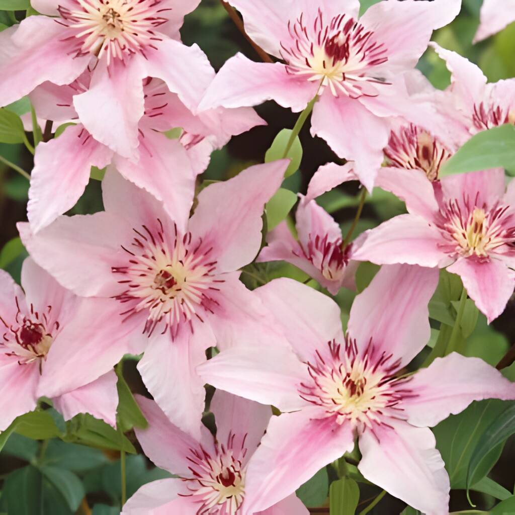 Clematis ‘Pink Fantasy’ typically grows to 1.5–2 metres in height with a spread of around 0.5–1 metre. Its compact, bushy habit makes it perfect for container planting or smaller gardens. Trained on a trellis or obelisk, it provides a neat vertical display of pale pink blooms with darker pink bars. Its long flowering season ensures continuous interest, while its manageable size makes it ideal for patios, balconies, and courtyards.
