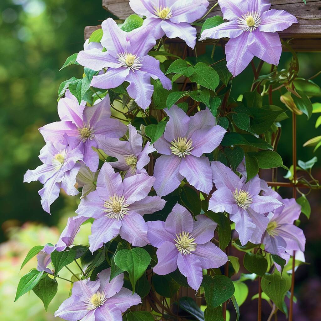 Clematis Reflections grows to a manageable height of approximately 1.2–1.8 metres, with a spread of 0.8–1.2 metres, making it perfectly suited for patios, balconies, or compact garden spaces. Each flower measures around 8–12cm across, showcasing soft lilac-mauve petals in semi-double form during the early flowering flush, followed by single blooms in late summer. Its compact habit allows it to climb trellises, obelisks, walls, or scramble through shrubs without overwhelming neighbouring plants, while still providing substantial vertical impact. Flowering occurs from early summer through to late summer, providing a prolonged and luminous display. The combination of layered lilac blooms and fresh green foliage adds depth and a romantic, ethereal quality to any garden corner, container, or contemporary urban planting scheme.