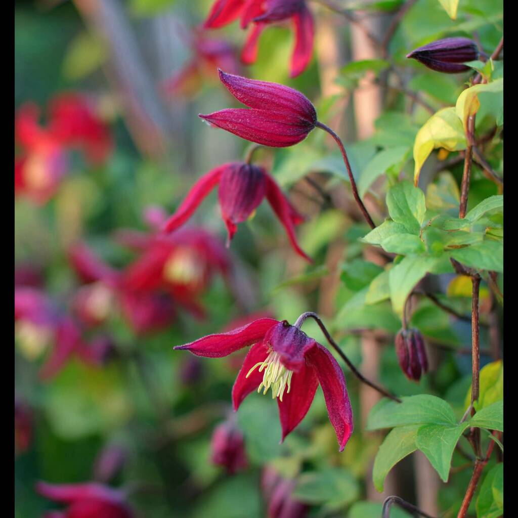 Clematis ‘Gravetye Beauty’ grows to approximately 2.5–3m (8–10ft) in height, with a spread of 1–2m (3–6ft), making it suitable for medium trellises, obelisks, and climbing through large shrubs. Individual tulip-shaped flowers measure roughly 6–8cm in length and gradually open to reveal a star-like form. The long flowering period from midsummer to early autumn ensures a continuous display of ruby-red colour, providing months of visual interest. Its moderate, vigorous growth habit allows versatile placement, including container planting, climbing along walls, or weaving through roses. The recurved petals and rich, jewel-toned colour catch the light beautifully, creating a radiant glow from a distance, while the central tuft of reddish-brown stamens adds intricate detail up close. Hardy and reliable, this variety is low-maintenance yet high-impact, perfect for gardeners seeking a dramatic, late-summer focal point.
