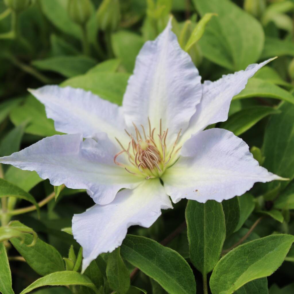Clematis ‘Tranquilite’ (Evipo111) is a carefully bred cultivar designed for modern gardeners seeking a compact, repeat-flowering climber with elegance and colour. Its parentage is selected to ensure reliable flowering, strong growth, and a manageable habit suitable for small gardens and container displays. Each plant develops healthy, mid-green deciduous foliage which contrasts beautifully with its soft lavender-blue star-shaped flowers. A paler central stripe and yellow stamens add delicate detail, enhancing its visual appeal from close-up or at a distance.
