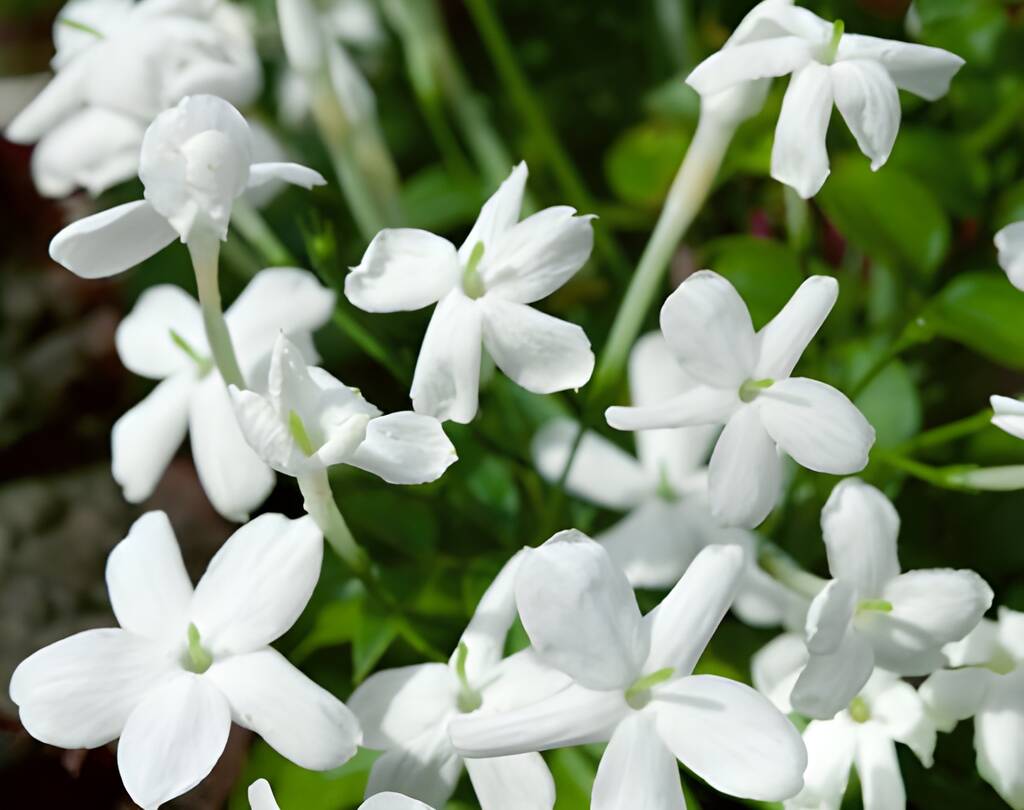 Jasminum officinale ‘Affine’ is a deciduous perennial climber selected for its enhanced flowering, vigour, and fragrance compared to standard common jasmine. This refined variety produces larger and more plentiful blooms, creating an impressive display throughout the warmer months. The flowers are pure white, star-shaped, and borne in generous clusters along long, twining stems, with buds often flushed pink before opening, adding subtle colour contrast and visual interest.